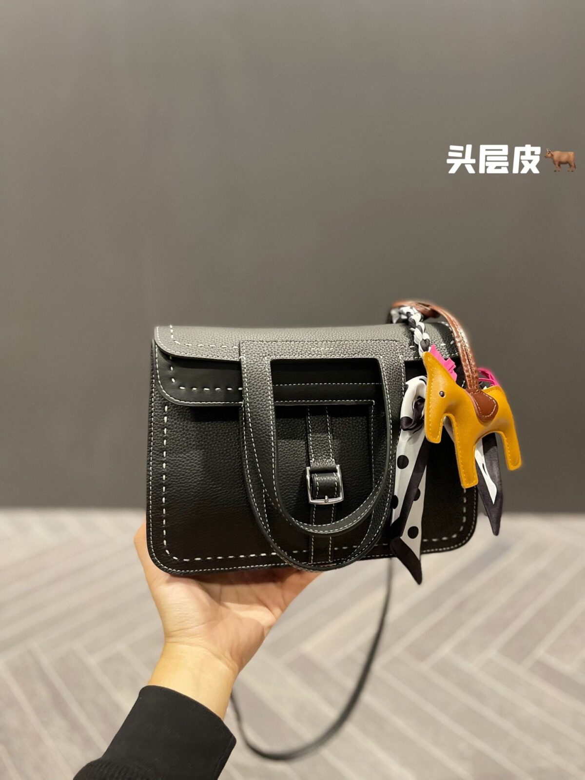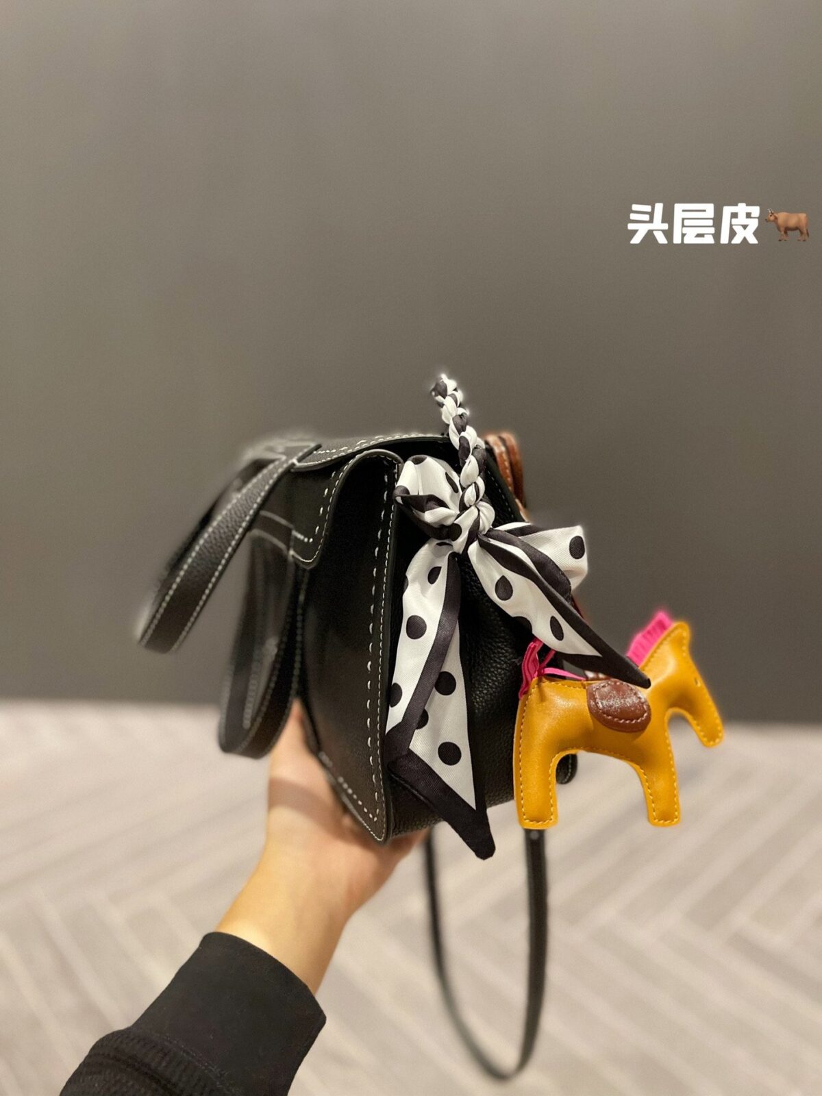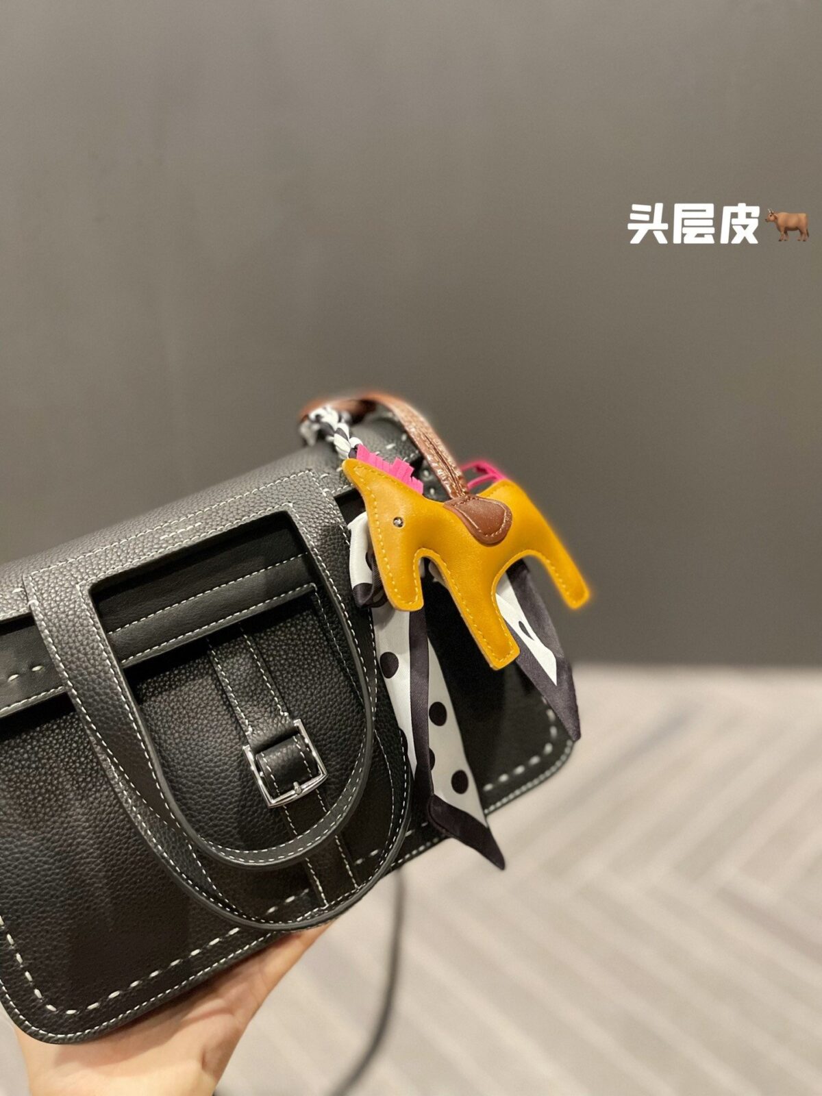 正如我们在造型展示中所呈现的那样,这款包袋因配饰的点缀而焕发出生机。经典的黑色皮革宛如一块完美的画布,衬托出随包附赠的波点真丝窄丝巾以及标志性的骏马挂饰。这些点睛之笔不仅致敬了品牌深厚的马术渊源,更注入了一抹俏皮的亮色——芥末黄与明艳粉——巧妙打破了单色皮革固有的沉稳严肃感。这是一种兼具高级时尚格调,却无需繁琐打理的轻松风格。