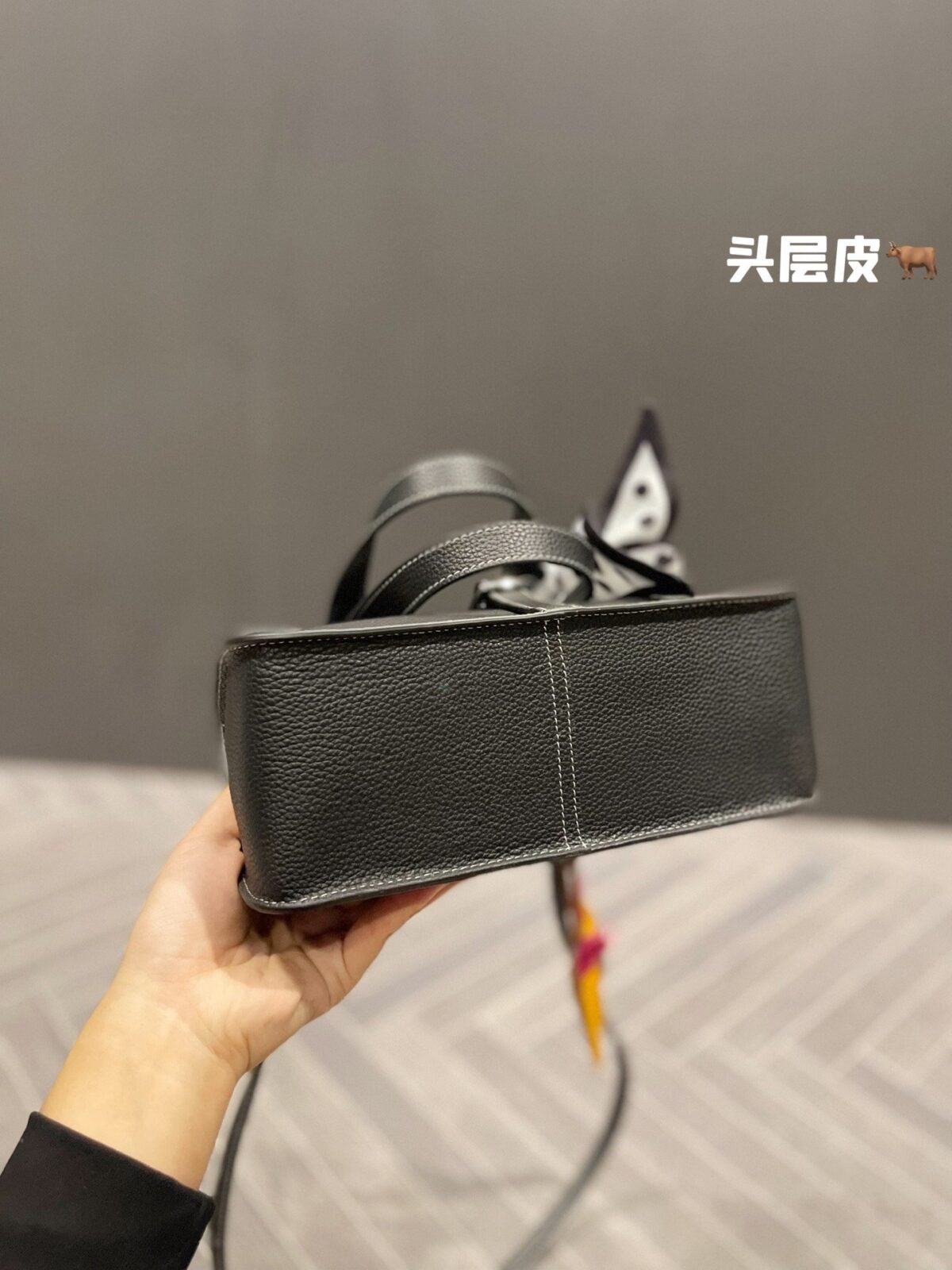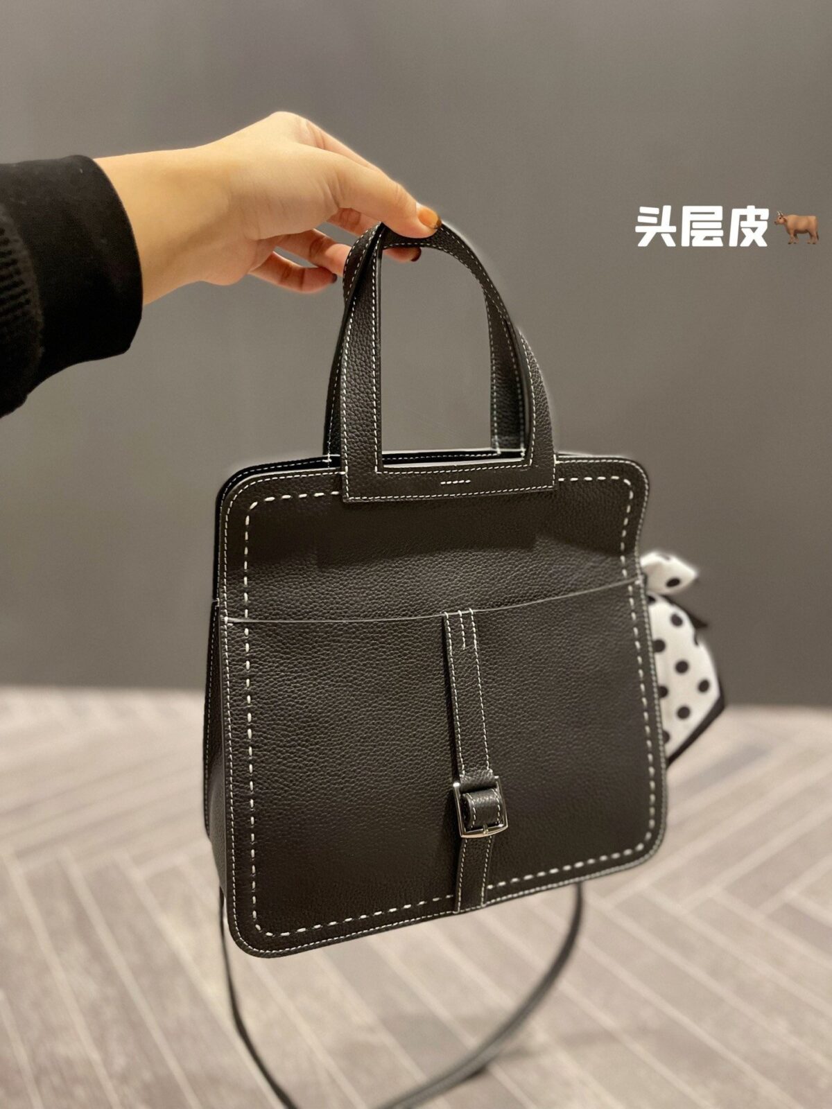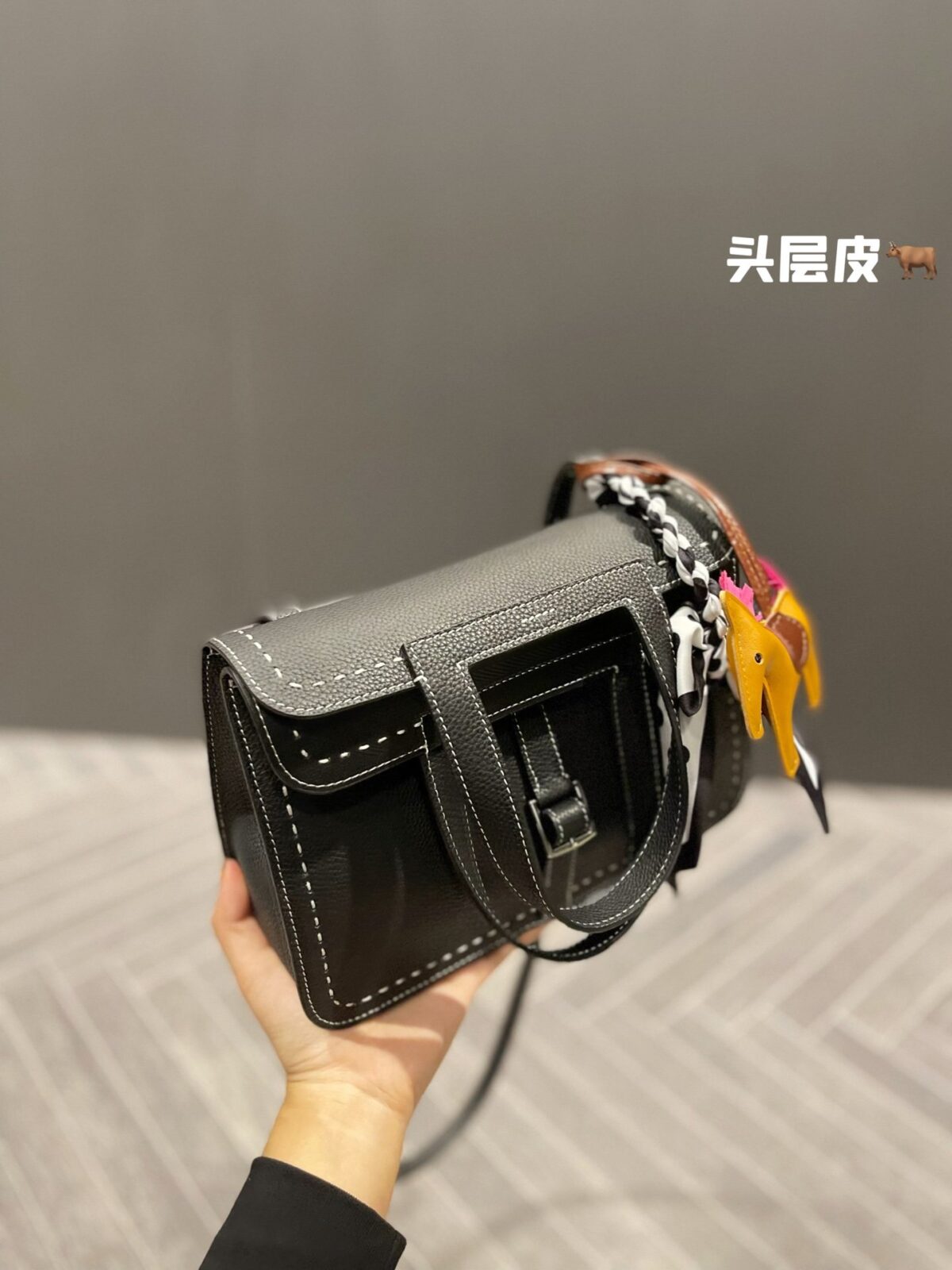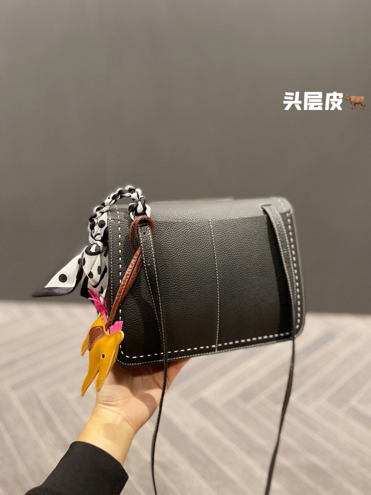 正如我们在造型展示中所呈现的那样,这款包袋因配饰的点缀而焕发出生机。经典的黑色皮革宛如一块完美的画布,衬托出随包附赠的波点真丝窄丝巾以及标志性的骏马挂饰。这些点睛之笔不仅致敬了品牌深厚的马术渊源,更注入了一抹俏皮的亮色——芥末黄与明艳粉——巧妙打破了单色皮革固有的沉稳严肃感。这是一种兼具高级时尚格调,却无需繁琐打理的轻松风格。