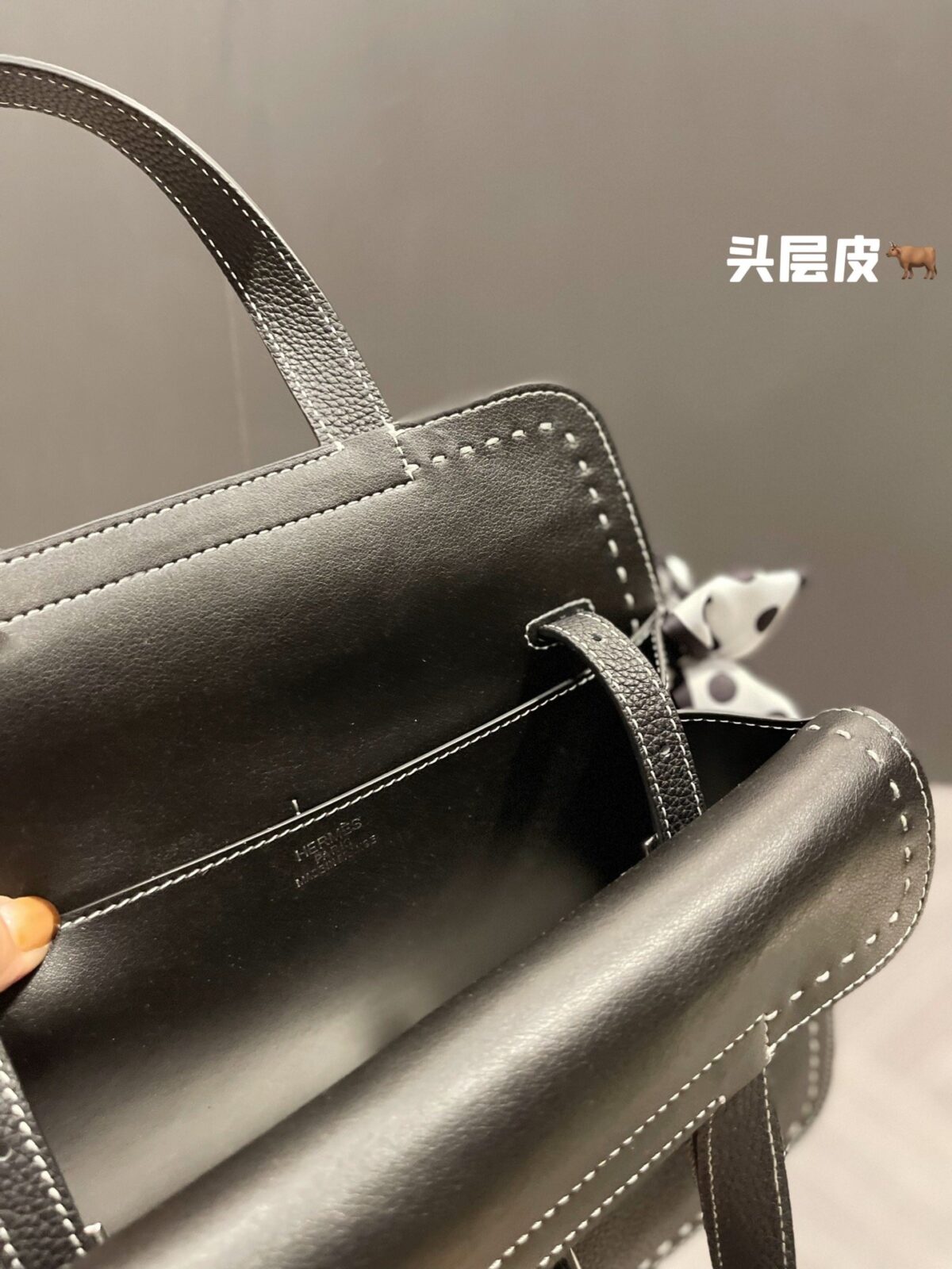【细节】请留意那醒目清爽的白色撞色缝线。这不仅仅是为了功能性,更是一种设计宣言——它勾勒出包身的建筑美学轮廓,突显了缝制如此顶级皮革所需的精湛匠人工艺。