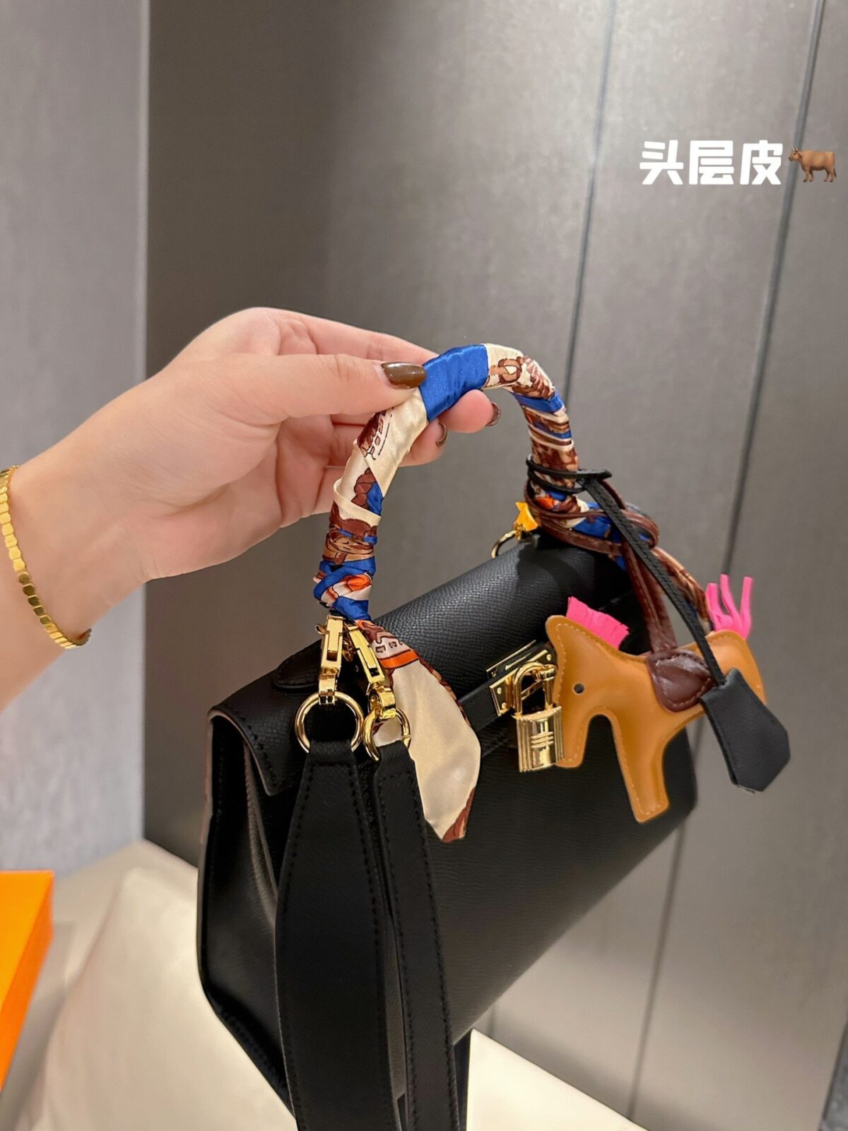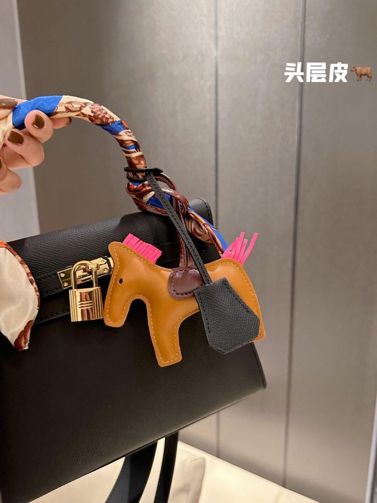 为了进一步提升您的造型格调,这款手袋特别搭配了精心甄选的配饰。手柄处巧妙地缠绕着一条色彩鲜艳、质地考究的真丝 Twilly 丝巾;它不仅能有效保护皮革免受手部油脂的侵蚀,更为手袋注入了一抹灵动迷人的艺术气息。包身侧面悬挂着我们标志性的皮革“Rodeo”小马挂饰——这一俏皮而不失优雅的点睛之笔,柔化了包袋硬朗的结构感,更彰显出您独特的个性。