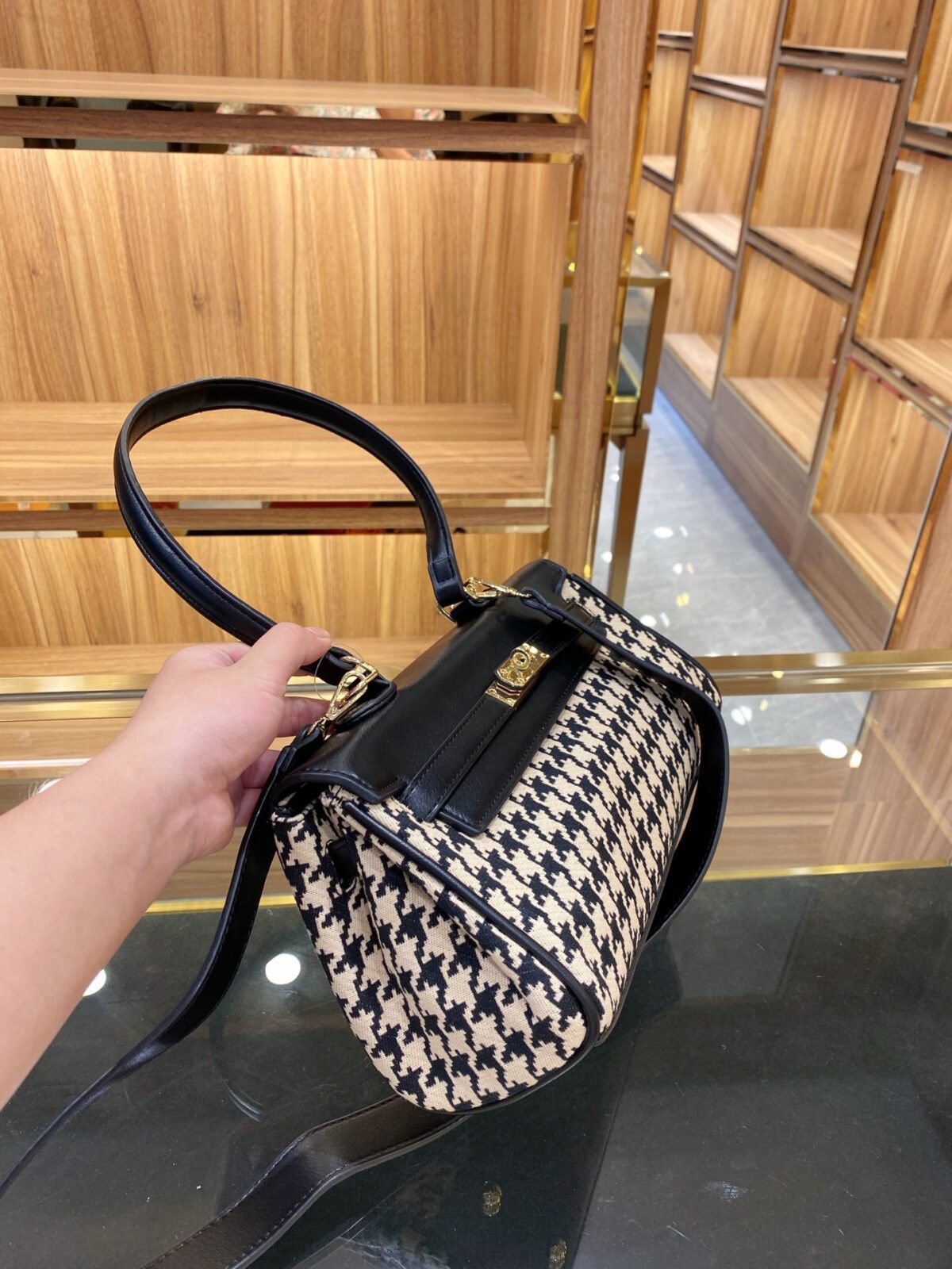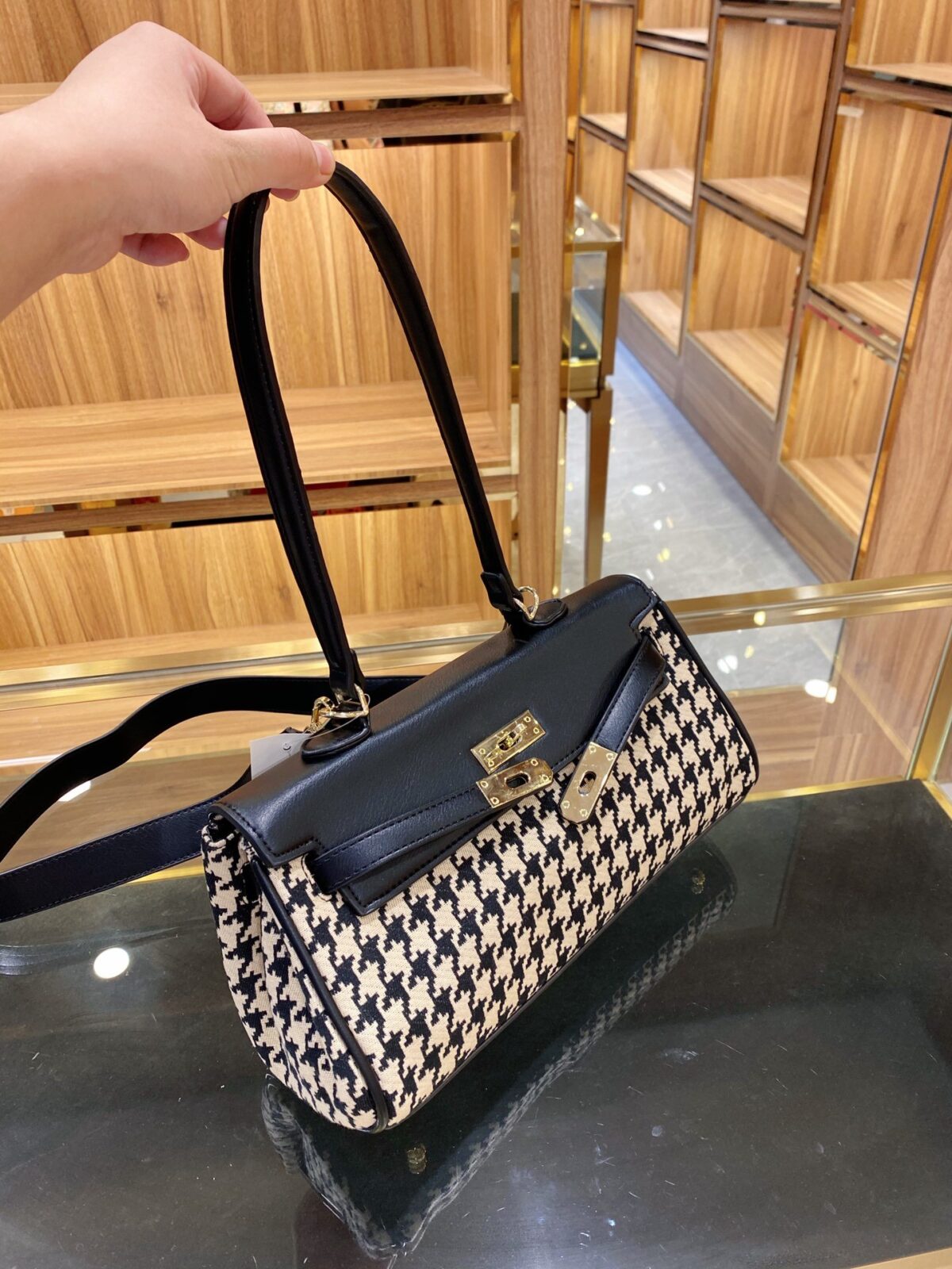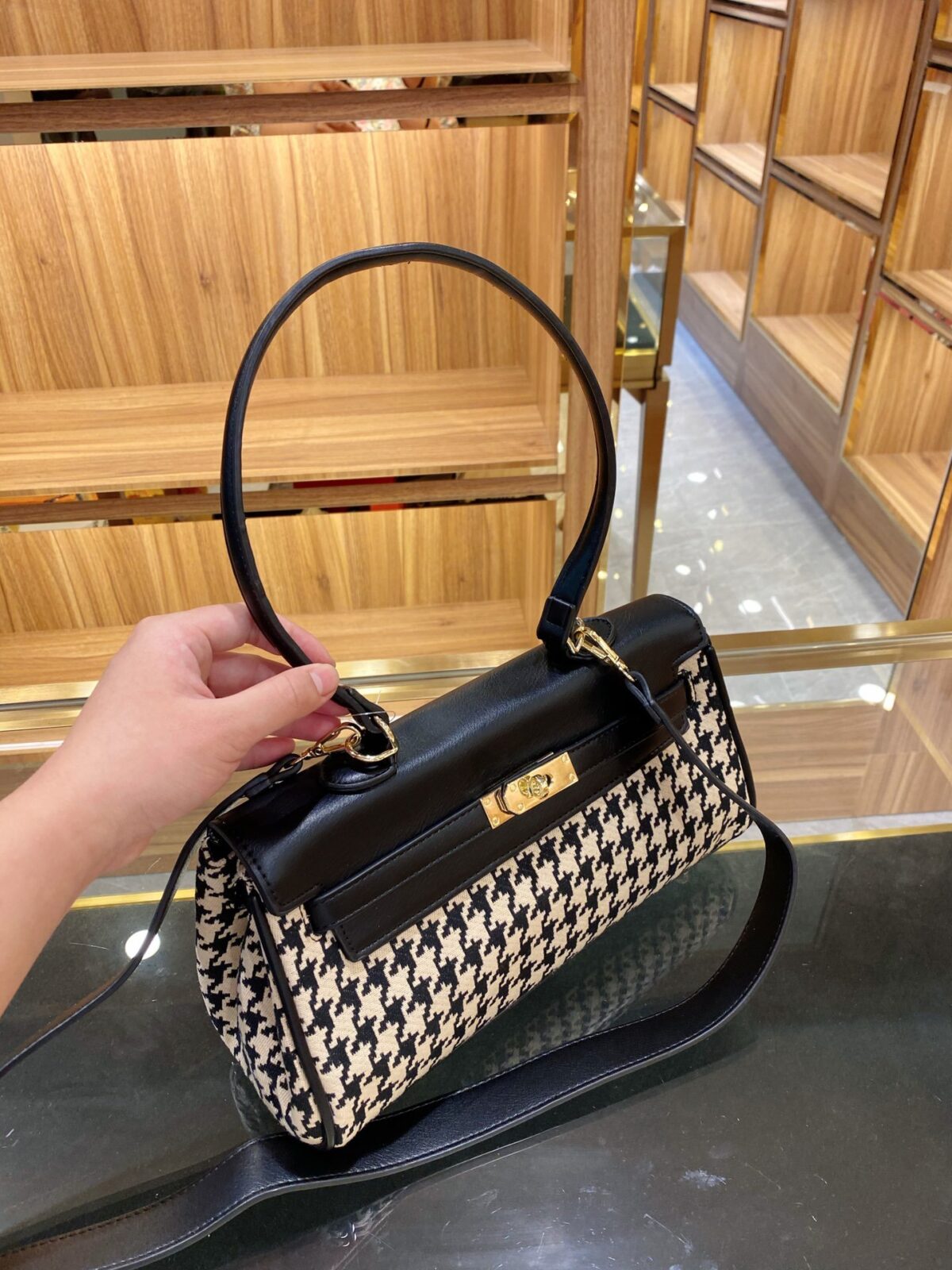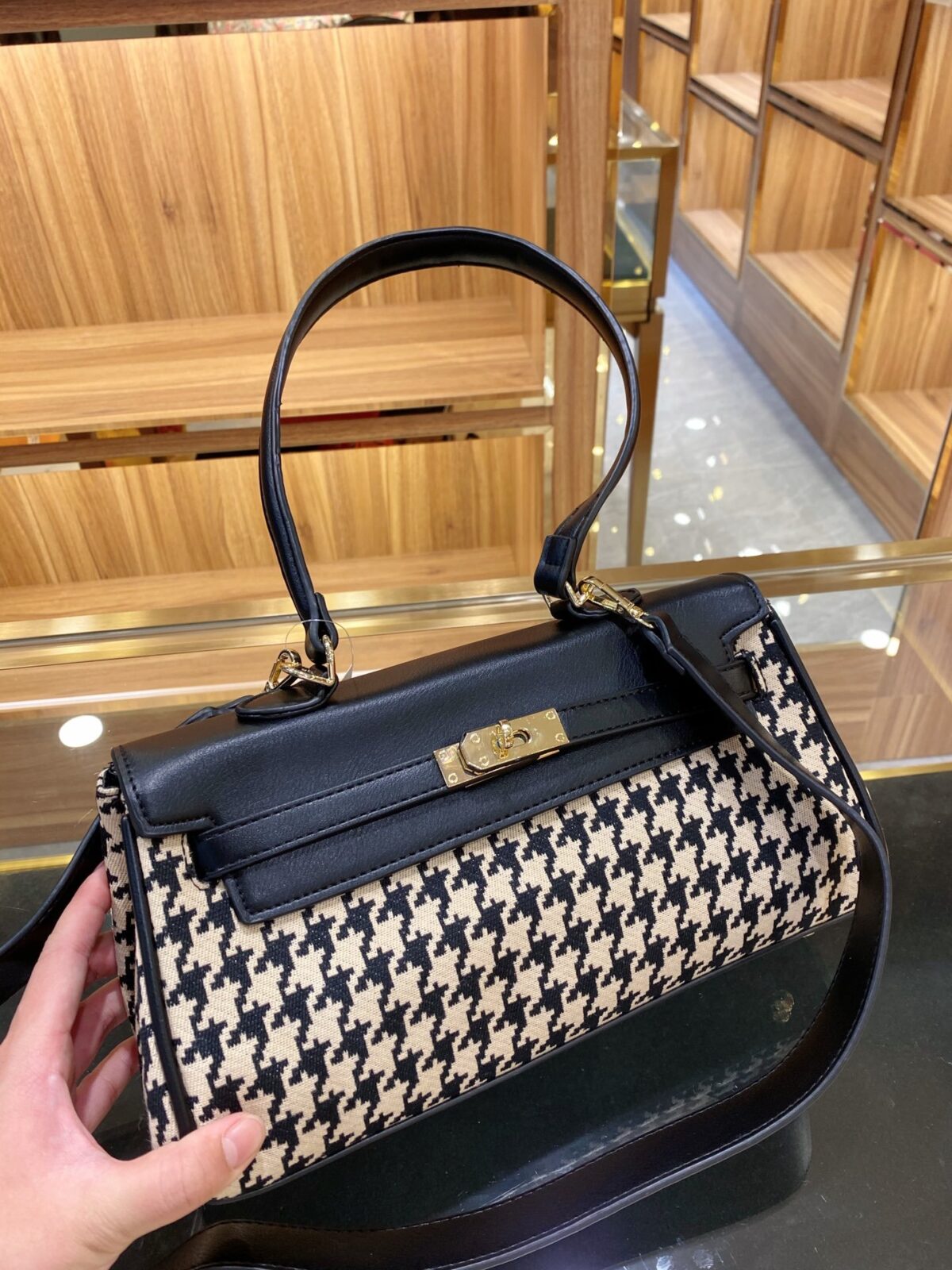 产品名称:复古千鸟格凯莉腋下包