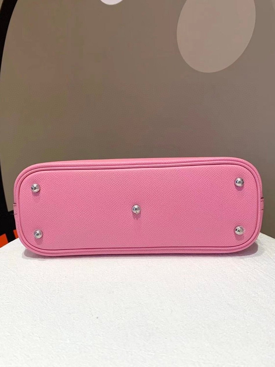 **顶级进口皮革与五金:** 手袋选用顶级皮革(Epsom/Veau Epsom 风格)制作,这种皮革以其挺括的结构和极强的耐刮擦性能而著称。五金配件采用高抛光钯金(银色调)饰面,呈现出一种既光洁又现代的对比美感。