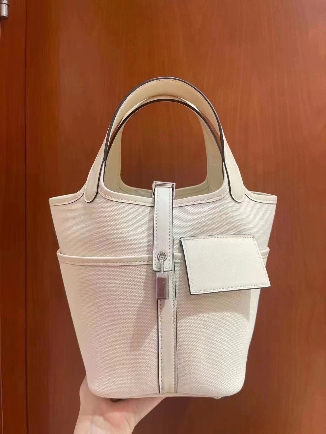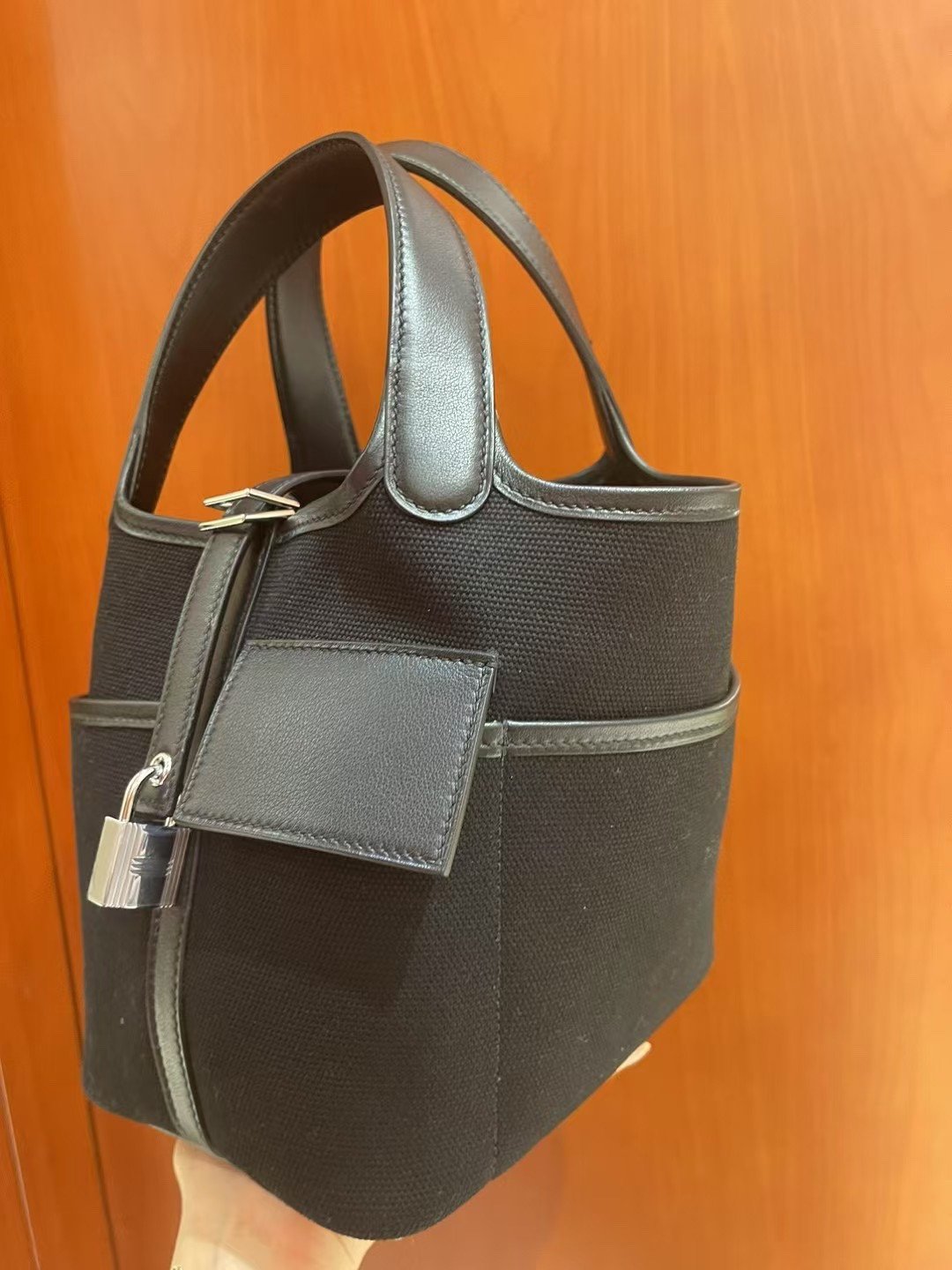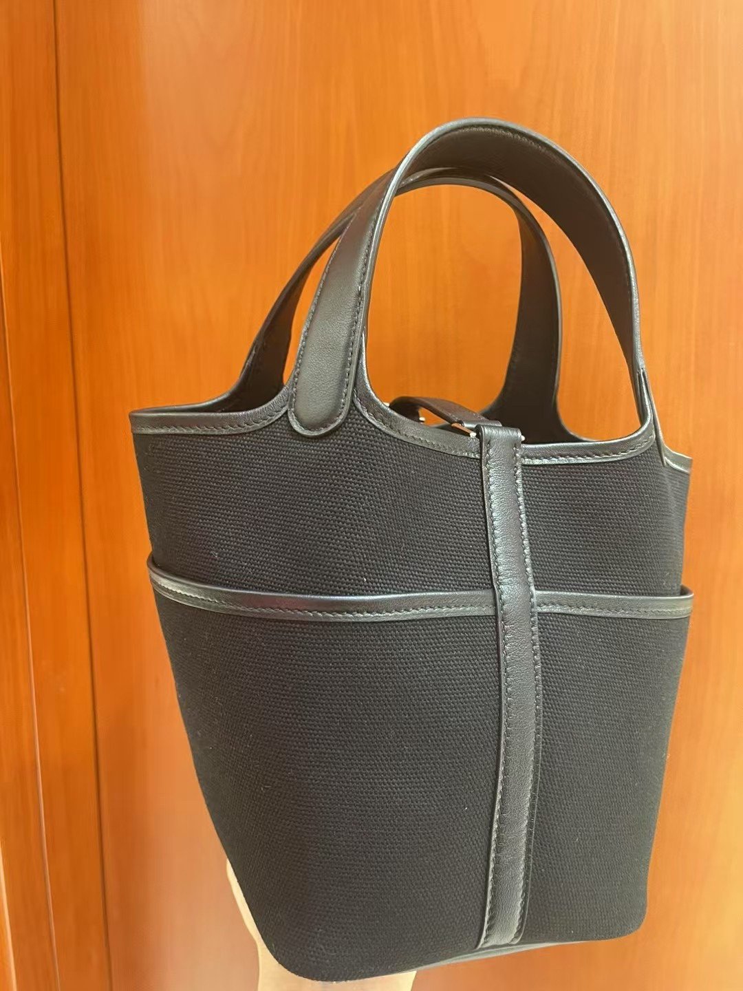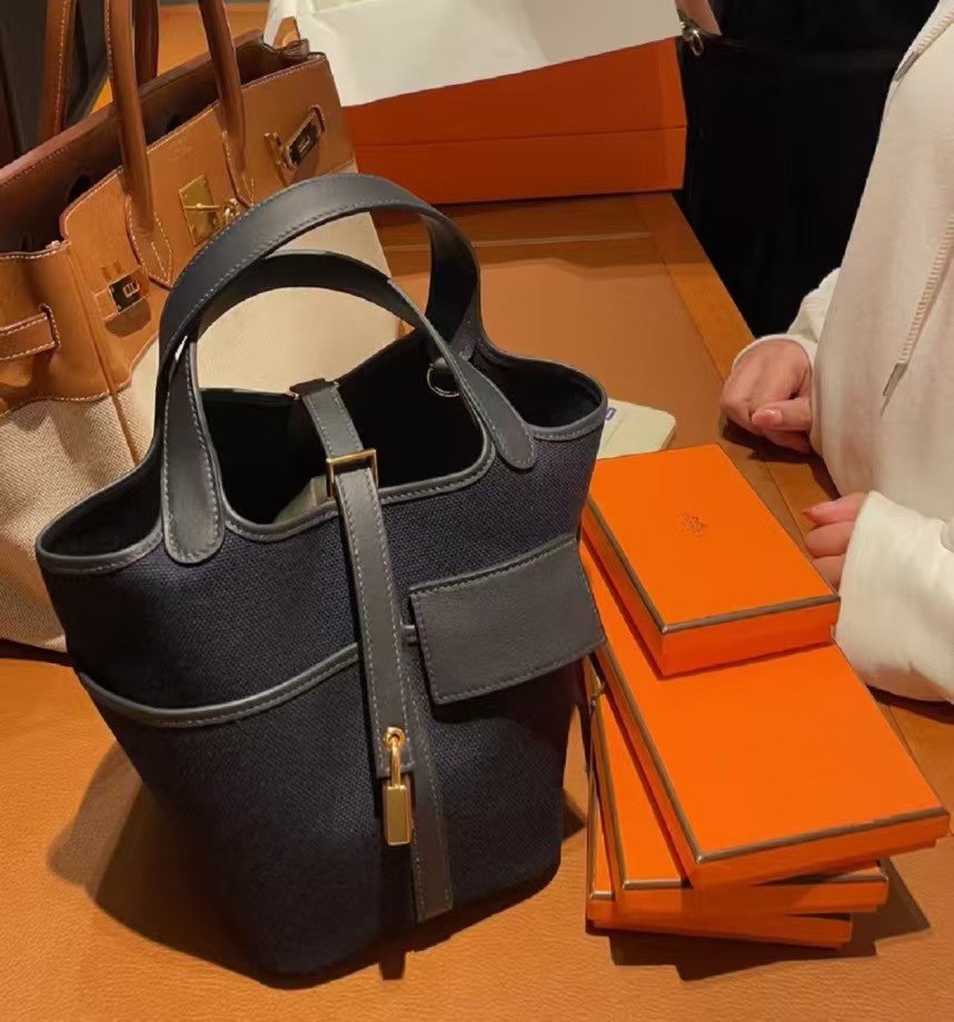 Picotin Cargo 18 是一款在设计上别具匠心、突破全皮经典款式的作品。这款包袋主要采用 Toile Goéland 面料制成——这是一种高性能且极其坚固的帆布材质——旨在确保包身即使在空置状态下也能保持其挺括的结构造型。与那些质地柔软、容易塌陷的皮革版本不同,其帆布包身呈现出一种利落、富有建筑美感的轮廓,能够始终保持直立不倒。