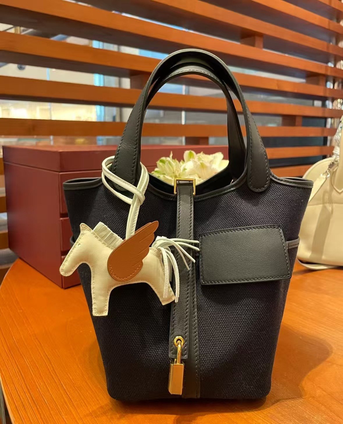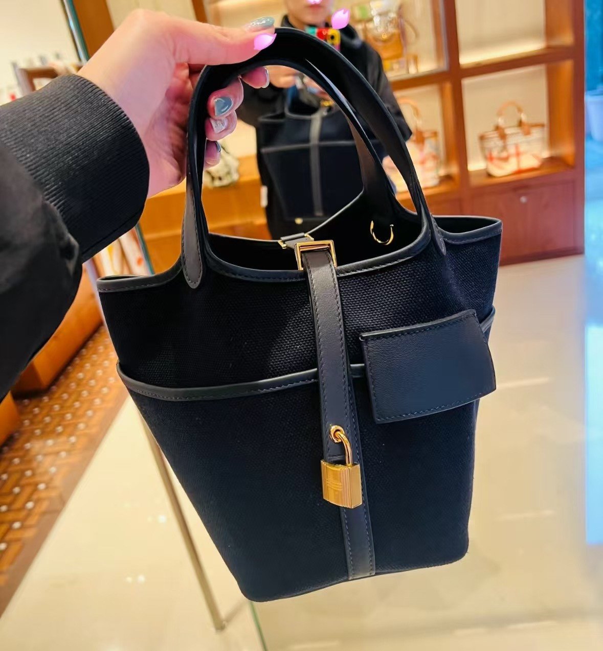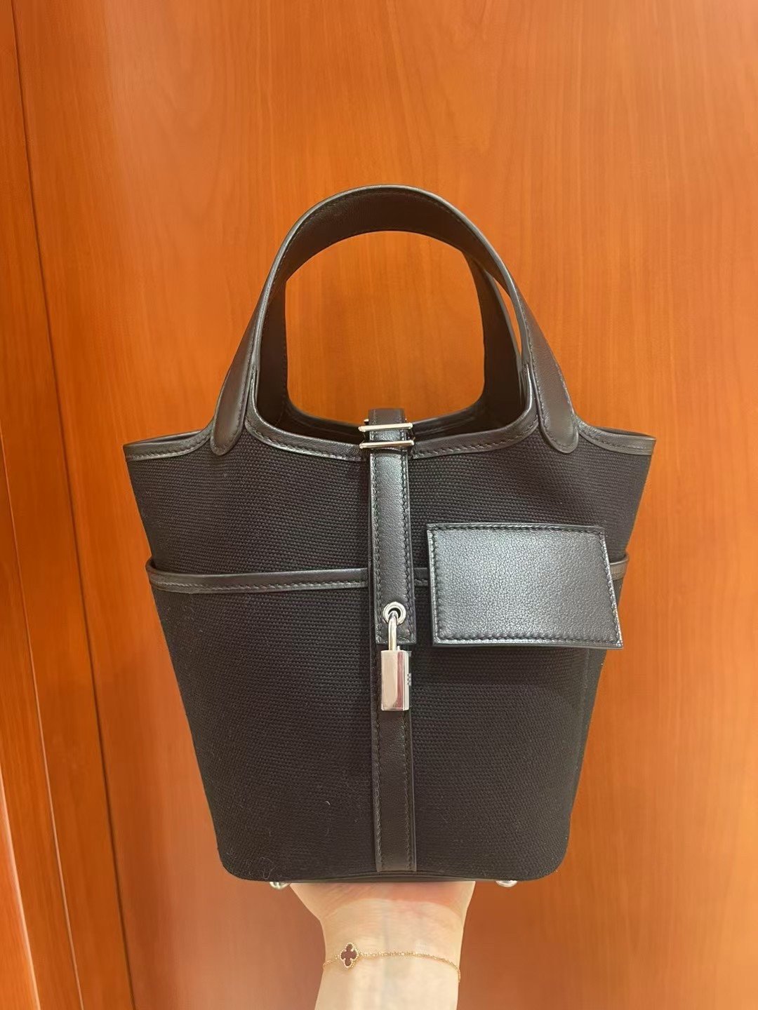 Picotin Cargo 18 是一款在设计上别具匠心、突破全皮经典款式的作品。这款包袋主要采用 Toile Goéland 面料制成——这是一种高性能且极其坚固的帆布材质——旨在确保包身即使在空置状态下也能保持其挺括的结构造型。与那些质地柔软、容易塌陷的皮革版本不同,其帆布包身呈现出一种利落、富有建筑美感的轮廓,能够始终保持直立不倒。