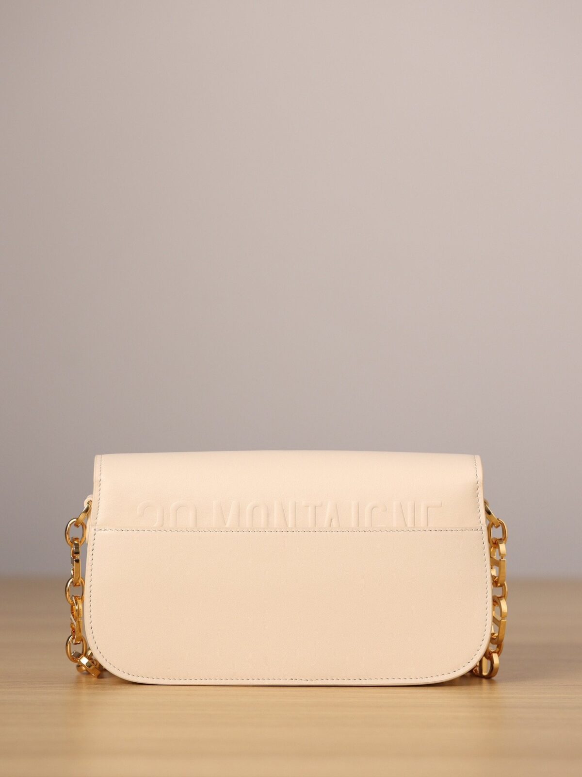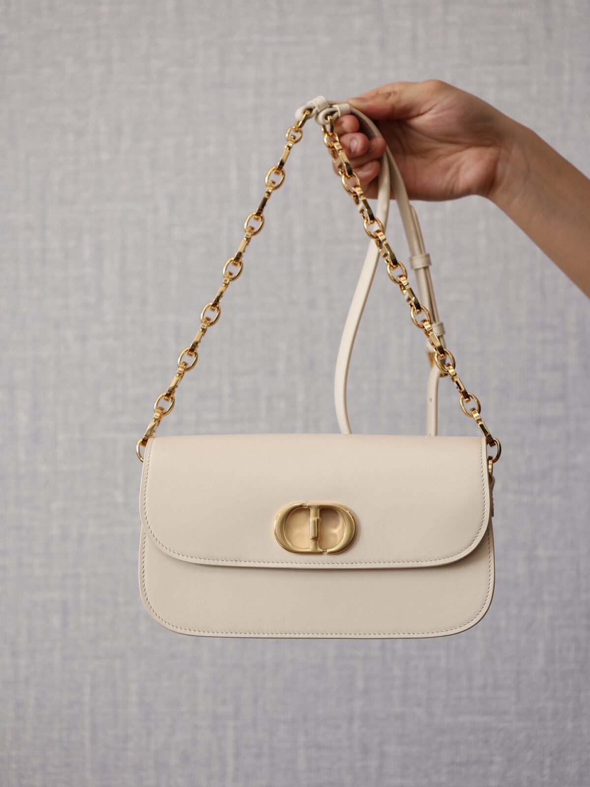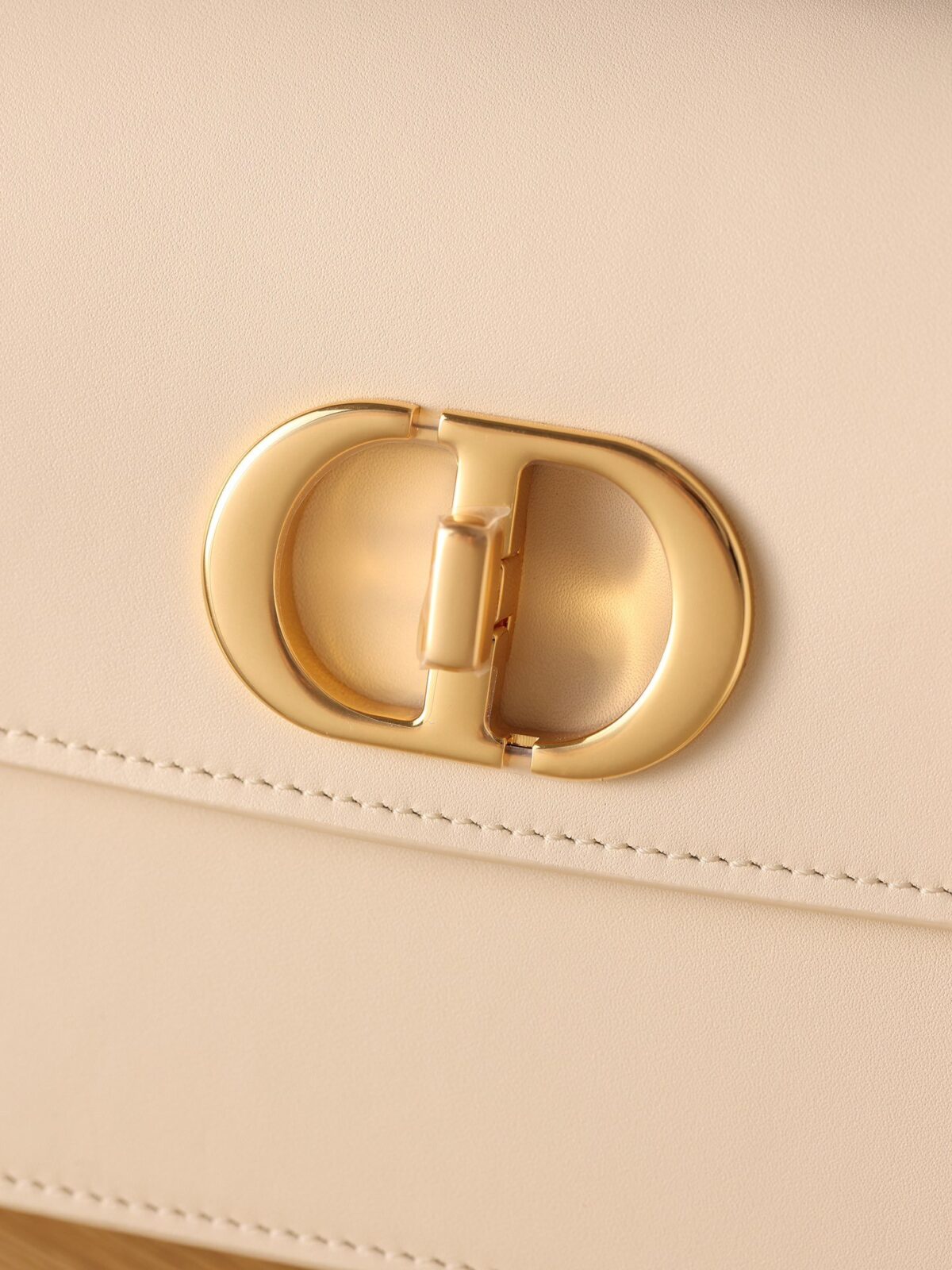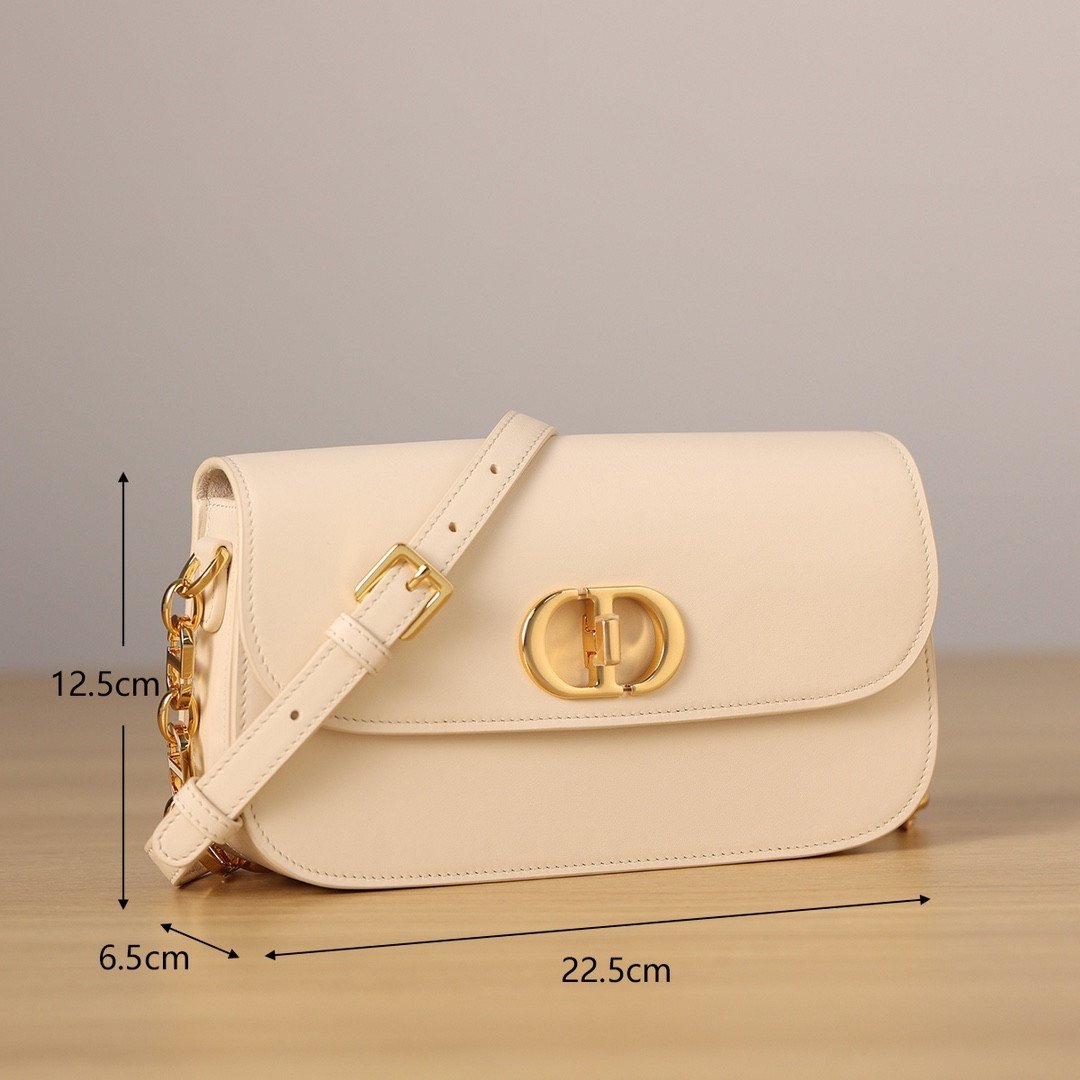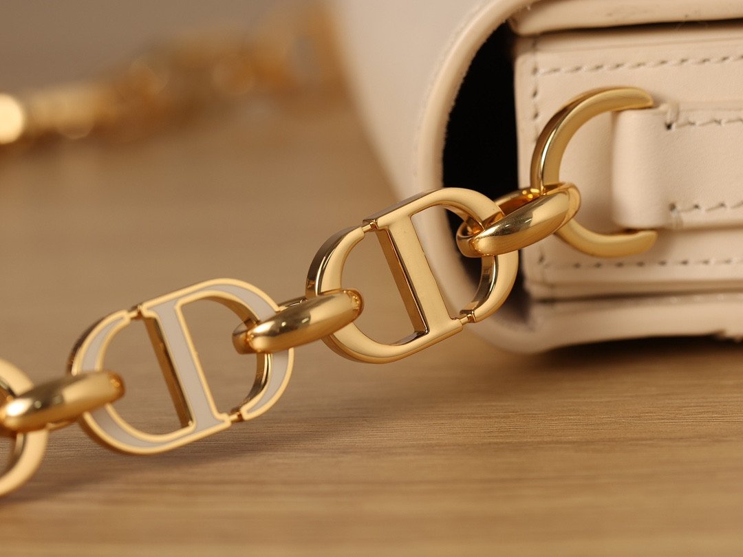 此款手袋选用精致细腻的灰象牙色光滑小牛皮精制而成,皮面泛着迷人的光泽,触感与外观同样奢华非凡。其标志性的美学特征在于圆润的翻盖设计,以及饰有做旧金色光泽的金属“CD”搭扣——这一细节的灵感正是源自 Christian Dior 香水瓶上的封印标志。对于那些注重细节的鉴赏家而言,手袋背面压印的“30 Montaigne”字样更是一处点睛之笔,低调而优雅地致敬了品牌显赫的传奇历史。