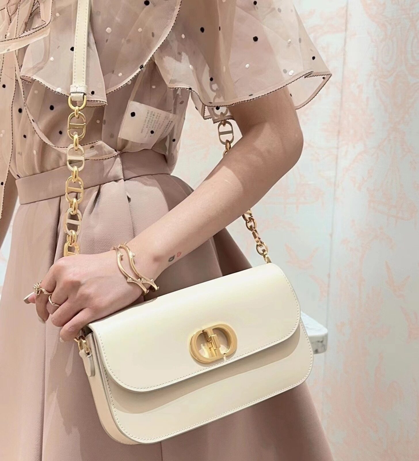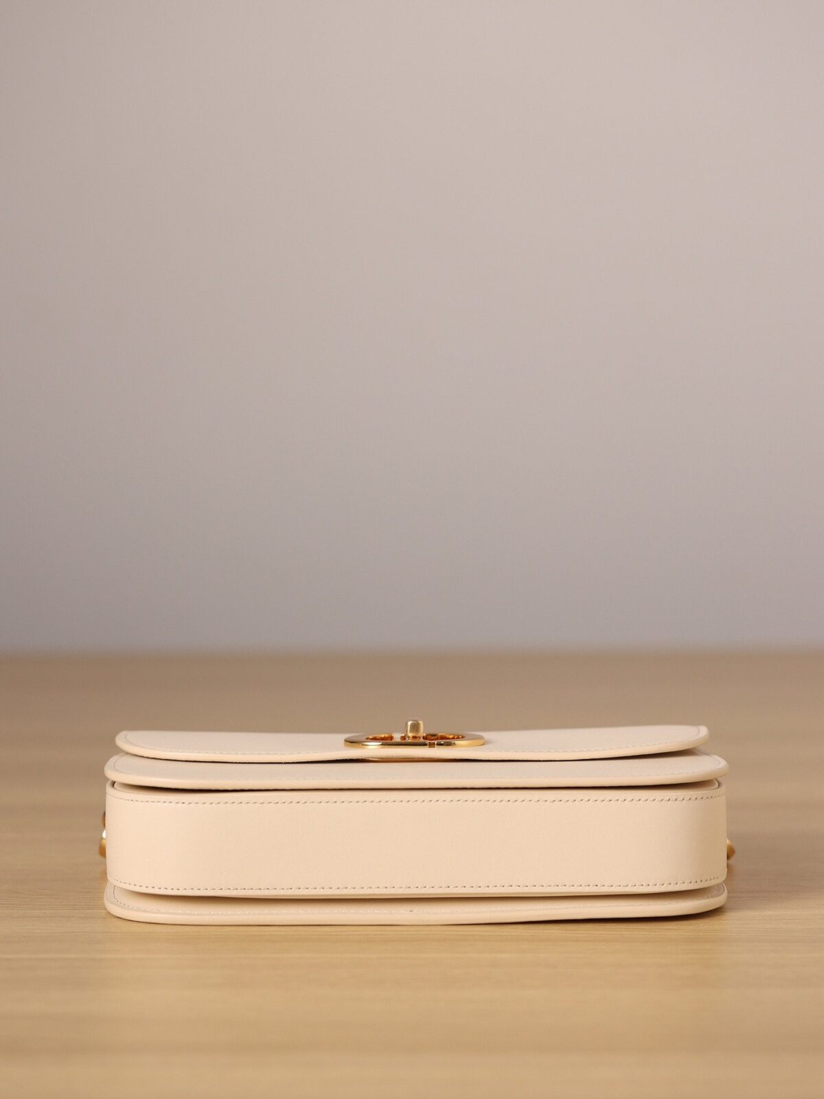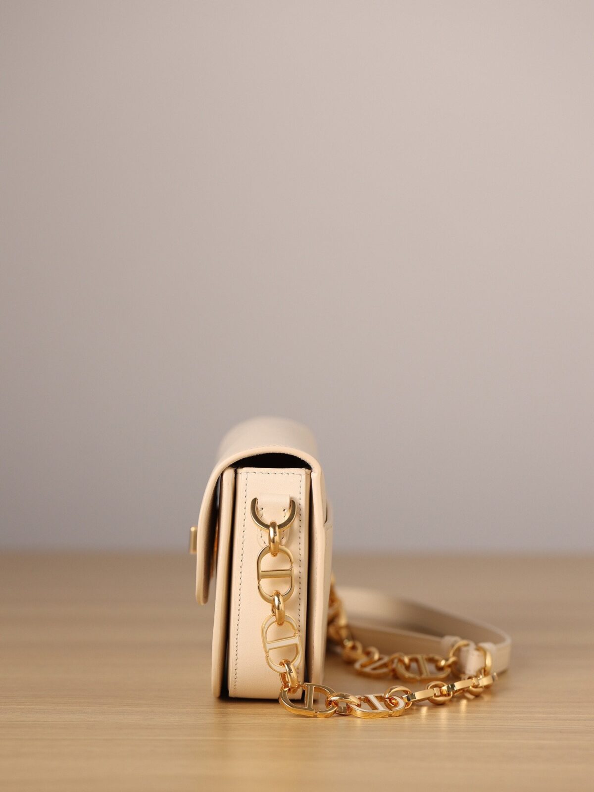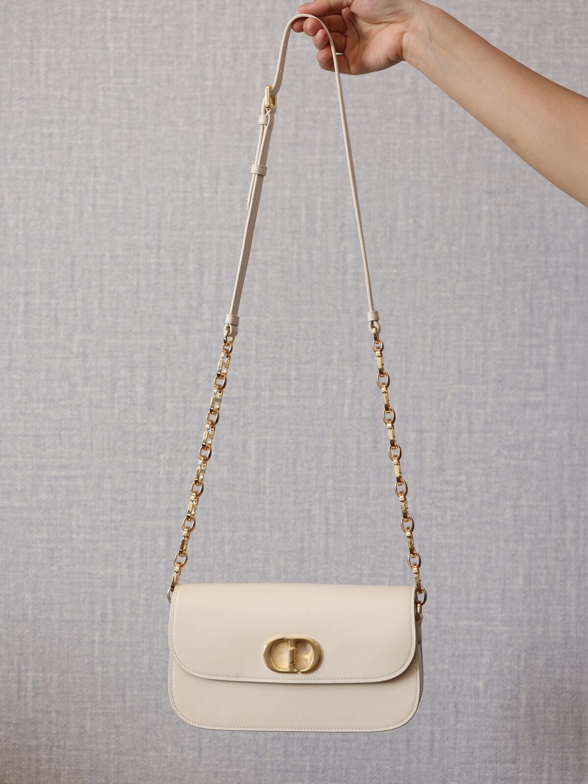 此款手袋选用精致细腻的灰象牙色光滑小牛皮精制而成,皮面泛着迷人的光泽,触感与外观同样奢华非凡。其标志性的美学特征在于圆润的翻盖设计,以及饰有做旧金色光泽的金属“CD”搭扣——这一细节的灵感正是源自 Christian Dior 香水瓶上的封印标志。对于那些注重细节的鉴赏家而言,手袋背面压印的“30 Montaigne”字样更是一处点睛之笔,低调而优雅地致敬了品牌显赫的传奇历史。