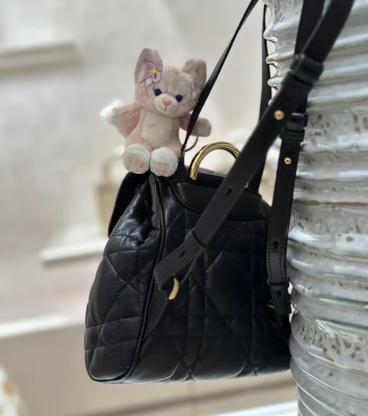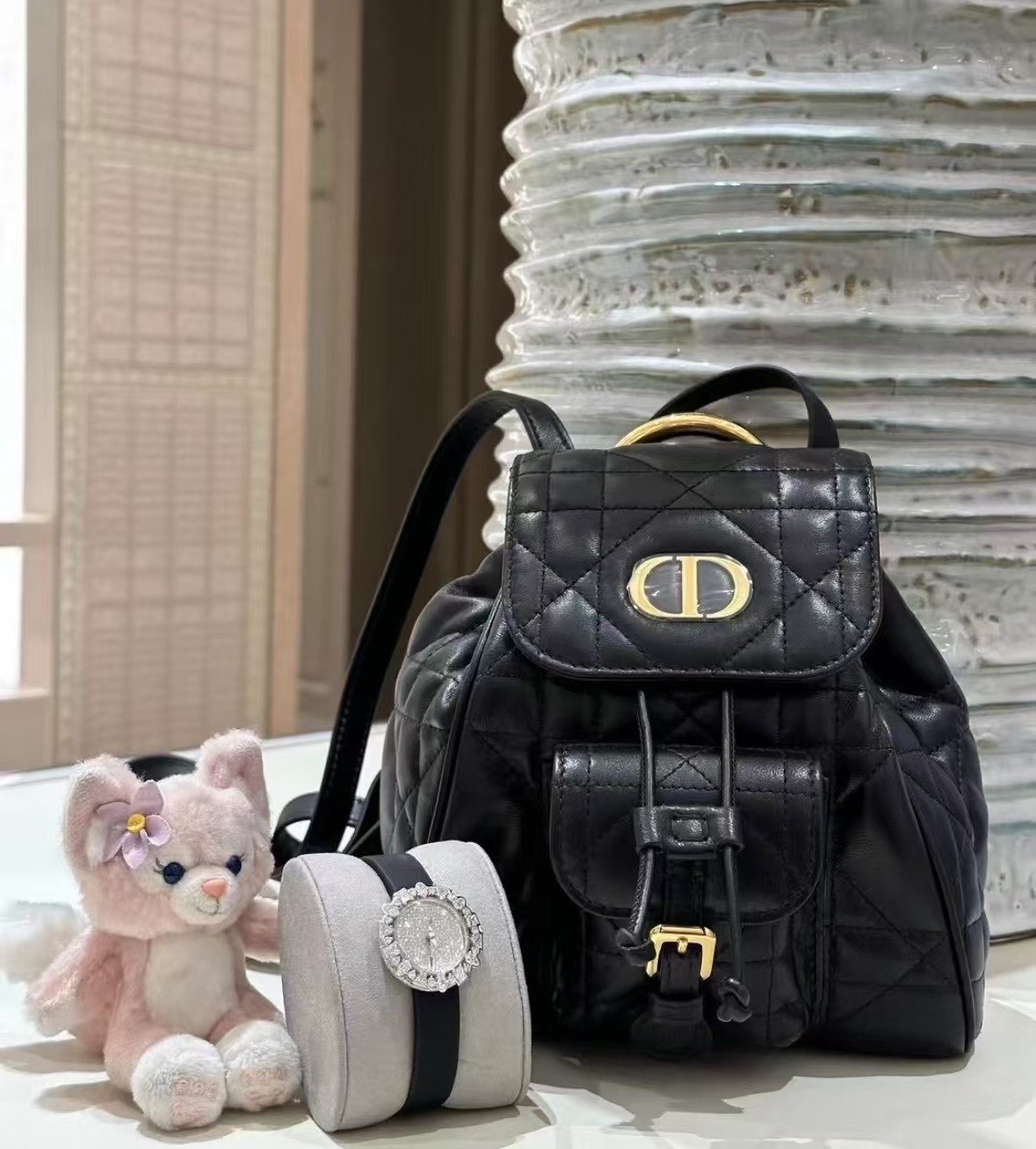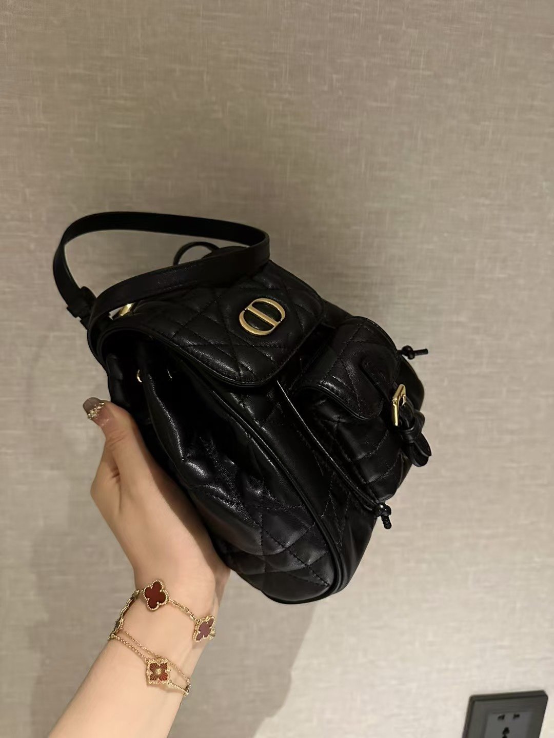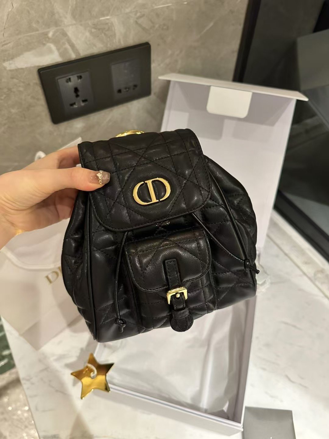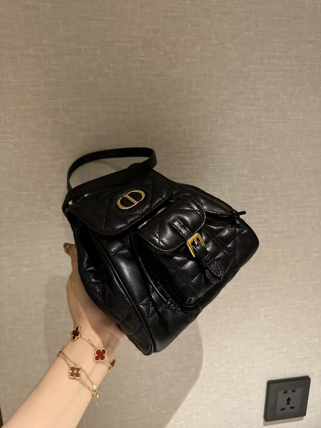 **大师工艺:24K真金电镀五金细节** 真正的奢华,往往体现在对细节的极致追求之中。这款双肩包上的五金配件,历经严苛的工业级精密加工,并采用了货真价实的24K真金电镀工艺。这绝非仅仅是表面的“金色涂层”,而是真金所特有的那种深邃、饱满且流光溢彩的色泽。无论是“CD”品牌标识,还是搭扣装饰,其分量感与质感都显得厚重扎实;其制作成本更是普通市售五金配件的三倍以上。这确保了金属部件色泽持久鲜亮、不易氧化变色,并能发出那种只有顶级工艺才能呈现的、独一无二的高端金属“清脆声响”与璀璨光芒。