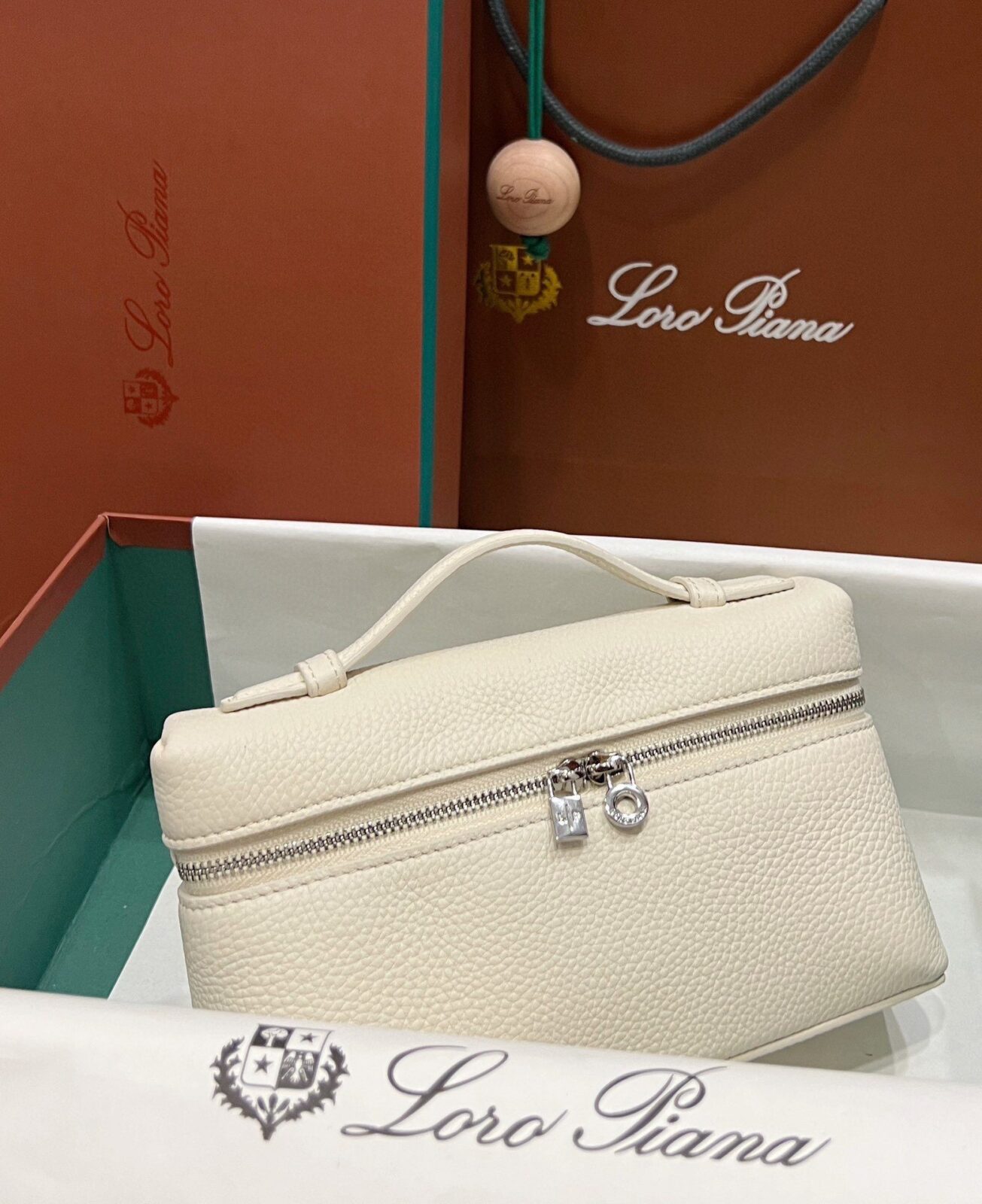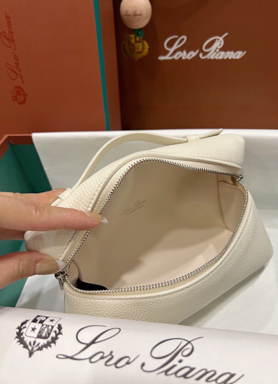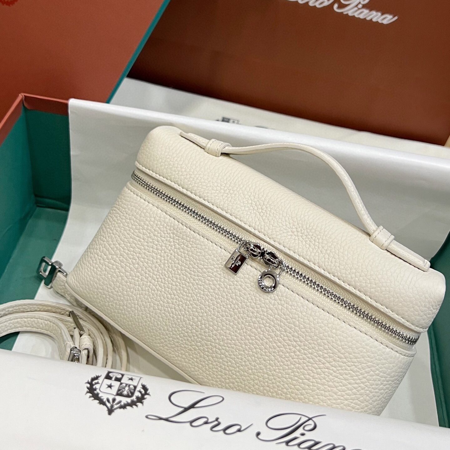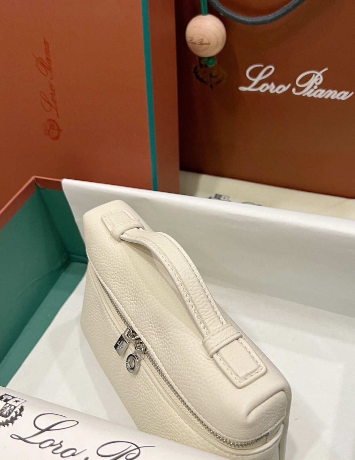 兼具美感与实用:尽管属于 L19 的“迷你”尺寸,但其方正的化妆箱式廓形内部空间却出人意料地宽敞,足以轻松收纳手机、钥匙和卡片。宽敞的双拉链开口饰有标志性的银色 LP 吊坠,不仅确保了取物的便捷性,更赋予了这款极简主义杰作一种宛若珠宝般的精致点缀。