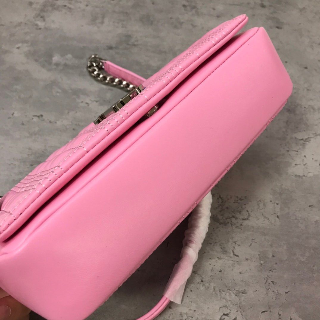 **多功能肩带**:配有光泽金属链条肩带及小羊皮肩垫,可调节长度,实现单肩或斜挎的多种背法。