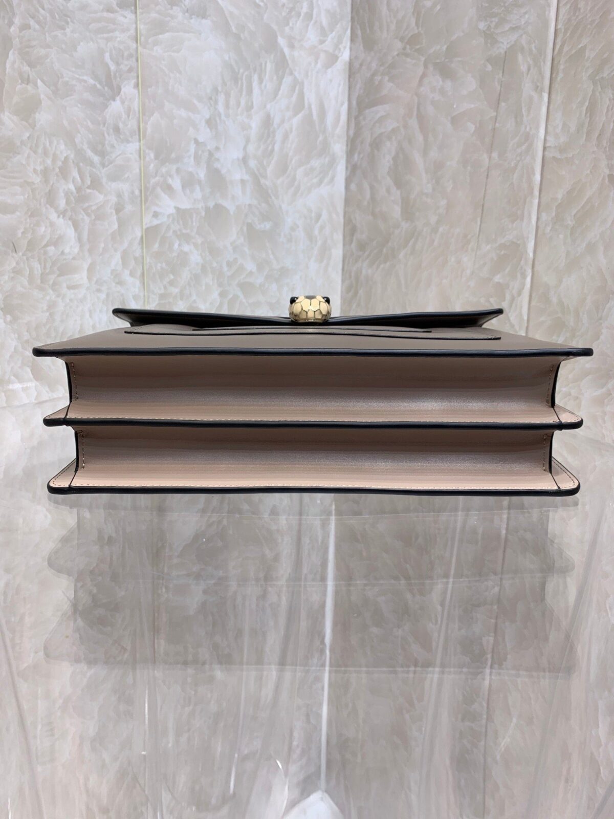 **标志性五金:** 饰有传奇的 Serpenti 蛇头搭扣,采用镀金黄铜材质,搭配黑/白珐琅鳞片及摄人心魄的孔雀石(绿色)双眸。