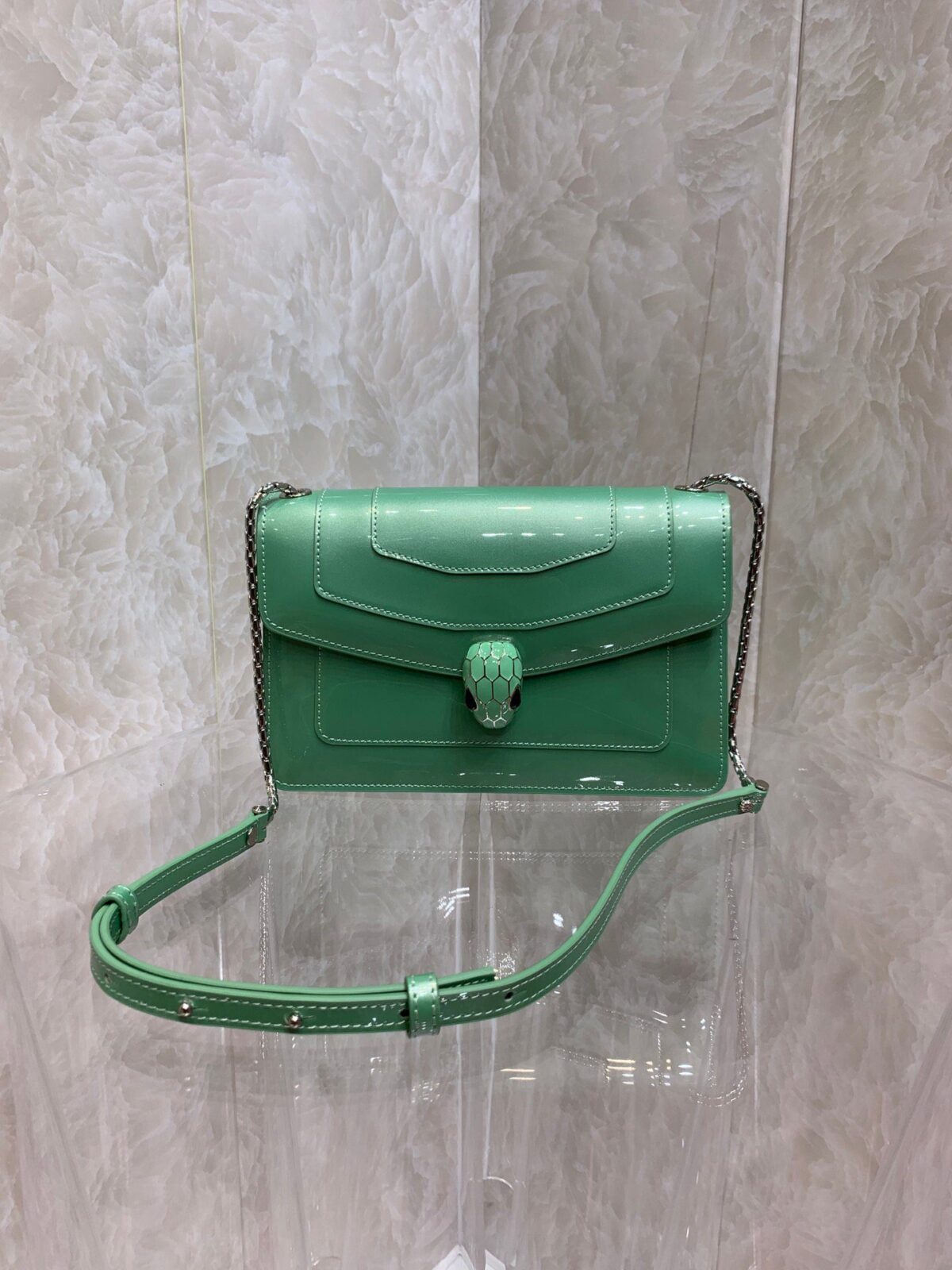 **璀璨光华** 宝格丽(Bvlgari)Serpenti Forever 系列手袋的“漆皮系列”完美演绎了罗马式奢华的精髓,是展现迷人女性魅力的时尚宣言。其皮革经过特殊的“晶透”漆面工艺处理,呈现出如镜面般的光泽;随着每一次的轻盈摆动,光线在包身流转,仿若一道划破长空的闪电,璀璨夺目。