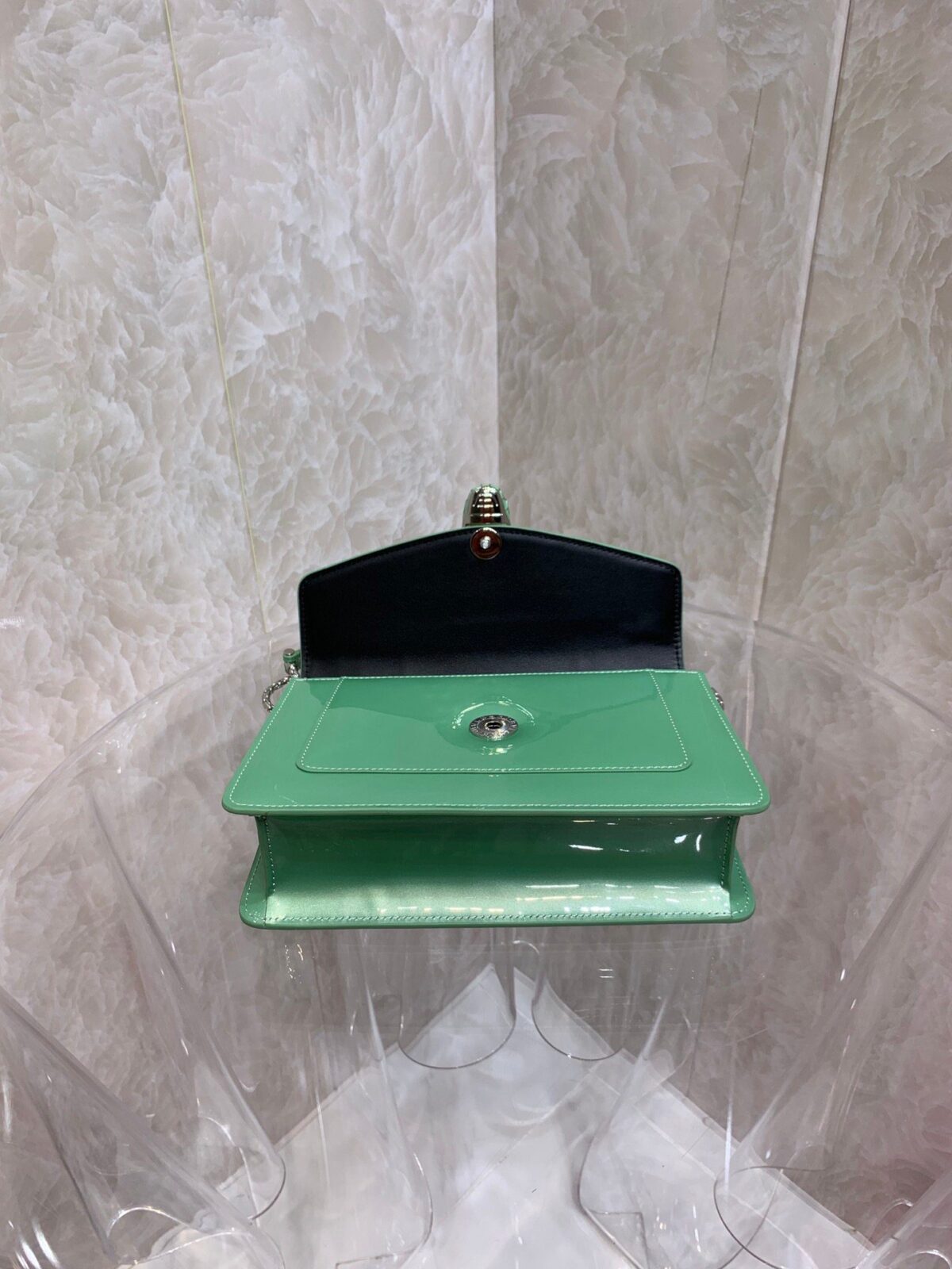**高光漆皮:** 呈现“晶透”般的通透质感,散发出如珠宝般璀璨迷人的光泽(提供绿色、粉色、深绿色及黑色可选)。
