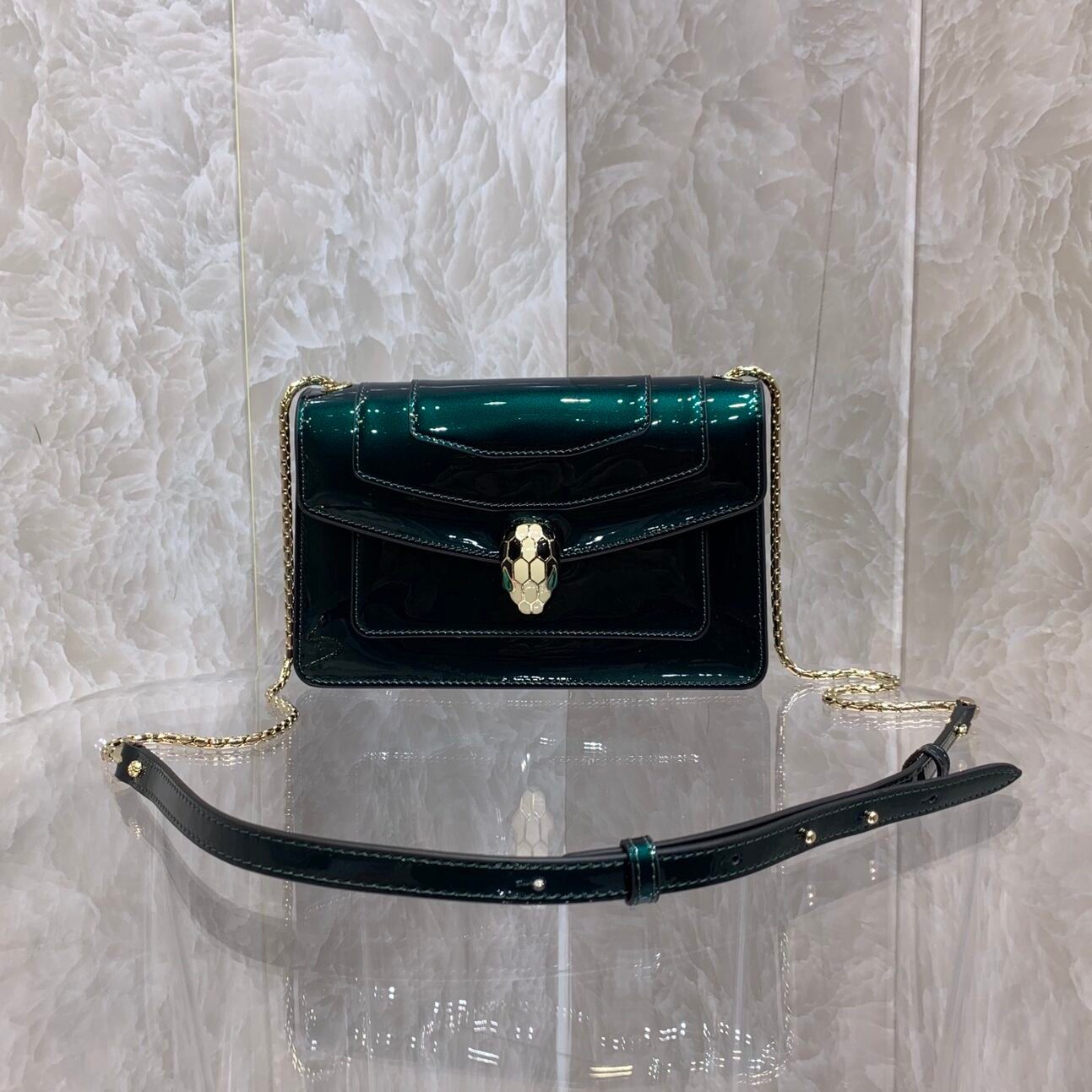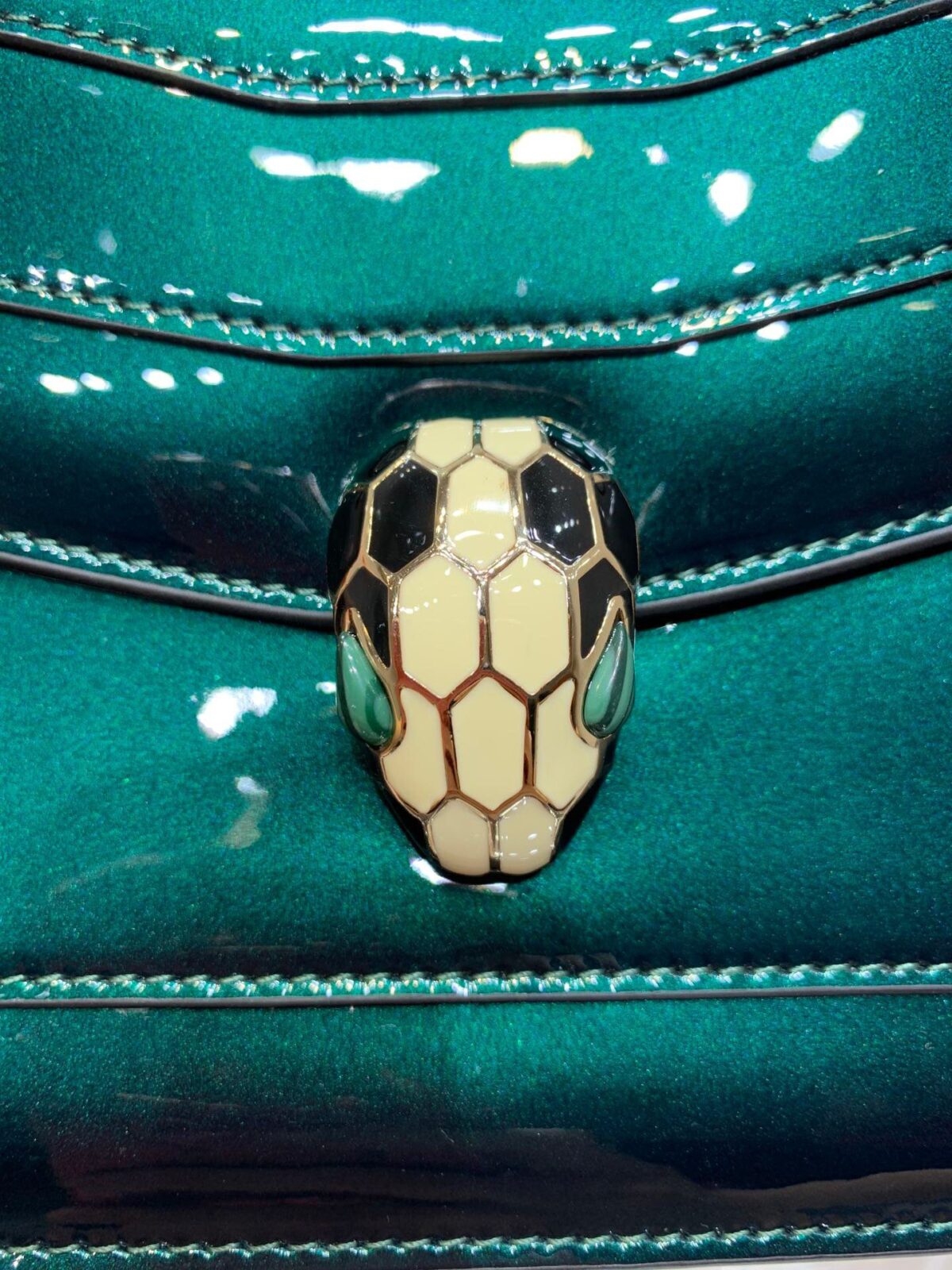 **标志性五金:** 采用品牌标志性的 Serpenti 蛇头搭扣,饰有珐琅鳞片及孔雀石双眸。