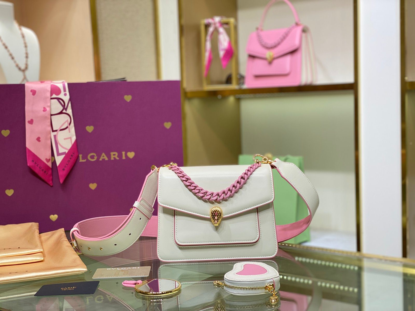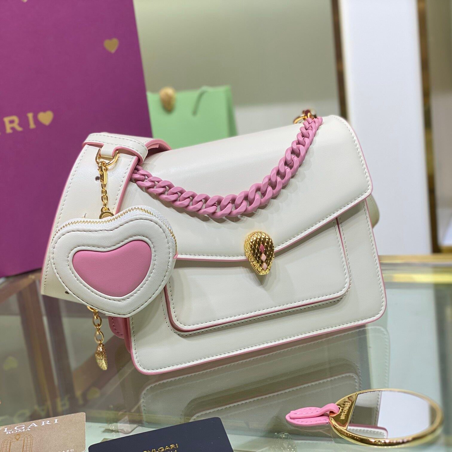 **经典系列:** 白色及米色款式则搭配璀璨夺目的金色链条,呈现出一种灵感源自珠宝、永恒经典的唯美意境。