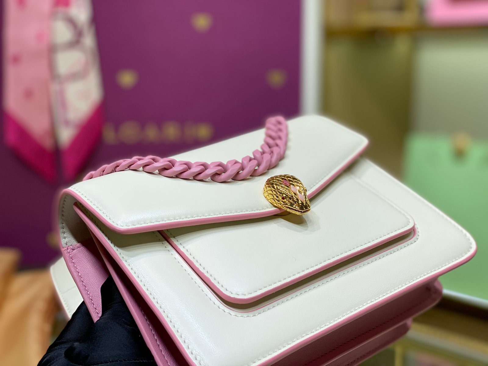 **经典标志的大胆重塑** Bvlgari Serpenti Forever Maxi Chain 包袋完美捕捉了现代大胆精神的精髓。这款包袋重新演绎了品牌传奇般的历史传承,将经典的蛇头图腾与极具现代感的大尺寸“Maxi Chain”链条手柄巧妙结合;链条手柄如项链般优雅地垂落在包盖之上,尽显非凡格调。