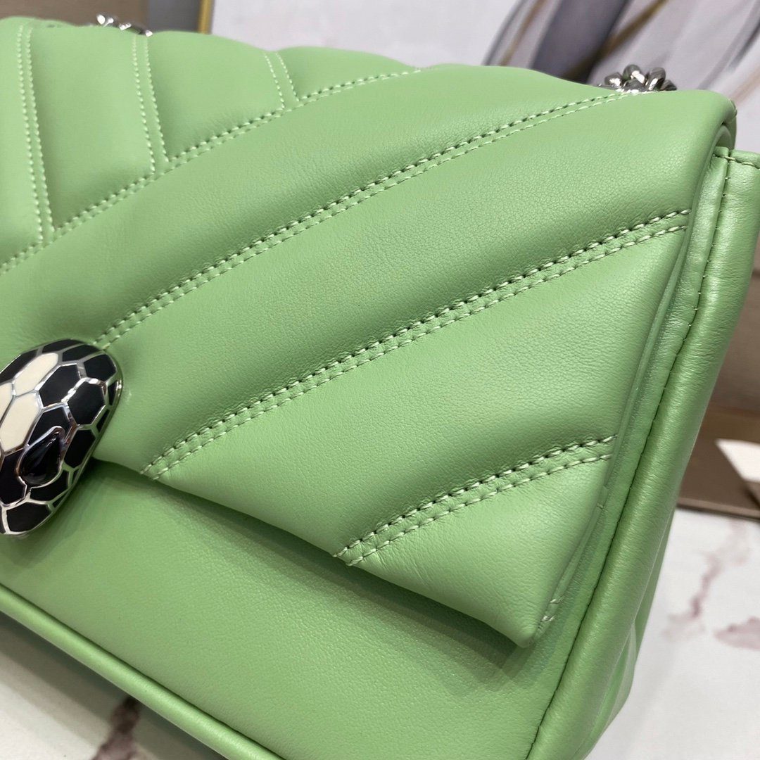 **多面切割的杰作** Bvlgari Serpenti Cabochon 单肩包以大胆的几何线条,重新定义了“柔美”的内涵。这款包袋从切割宝石的表面汲取灵感,采用顶级小羊皮打造出“Maxi Matelassé”超大凸面几何绗缝图案(呈人字形/V字形)。其成品外观如云朵般蓬松柔软,却依然保留着结构分明、充满建筑美感的轮廓。