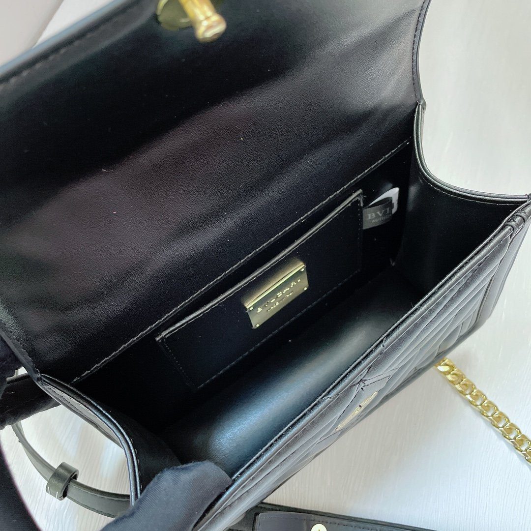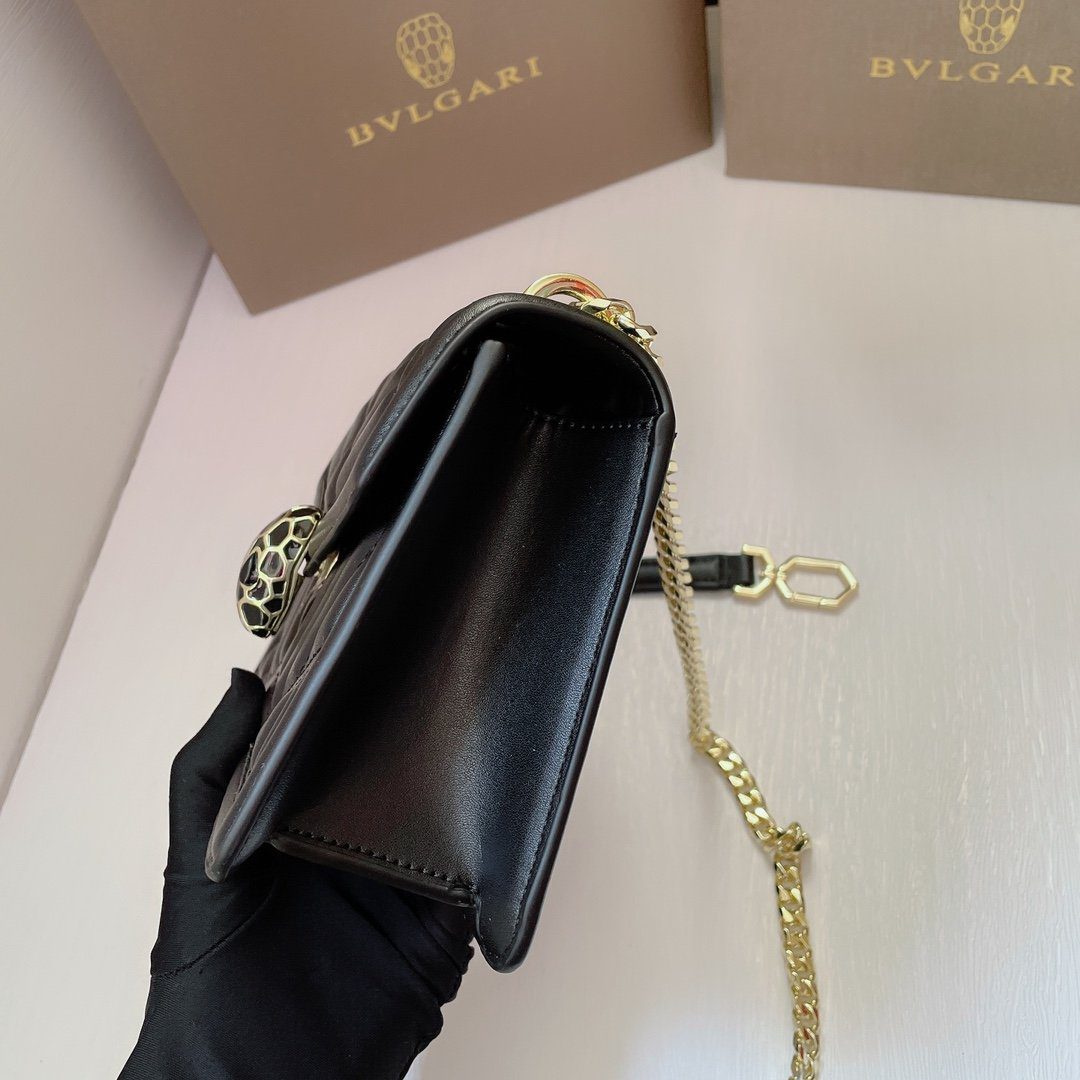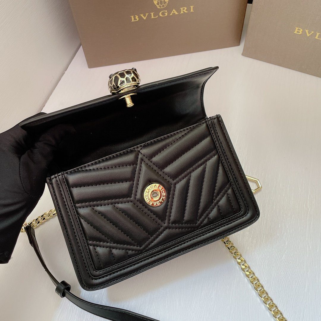 标志性细节:包袋前翻盖由传奇的“蛇头”搭扣稳固闭合;这一搭扣饰有哑光黑色珐琅鳞片与摄人心魄的黑色缟玛瑙双眸,宛如一颗璀璨的宝石,成为整款包袋的点睛之笔。包袋内部空间紧凑(尺寸为20厘米),容量恰好足以收纳日常随身必备品;内衬背面饰有 Bvlgari 金属品牌标识,并内置一面专属定制的化妆镜。