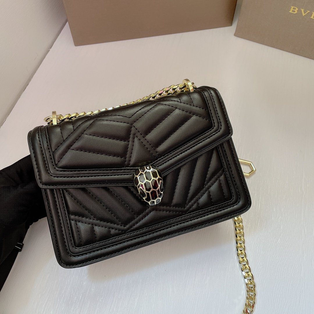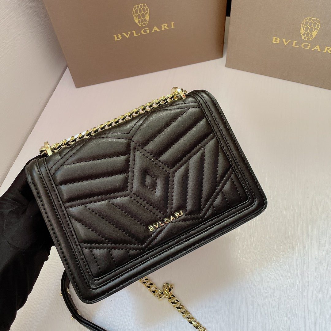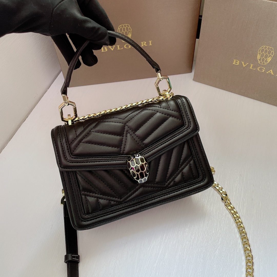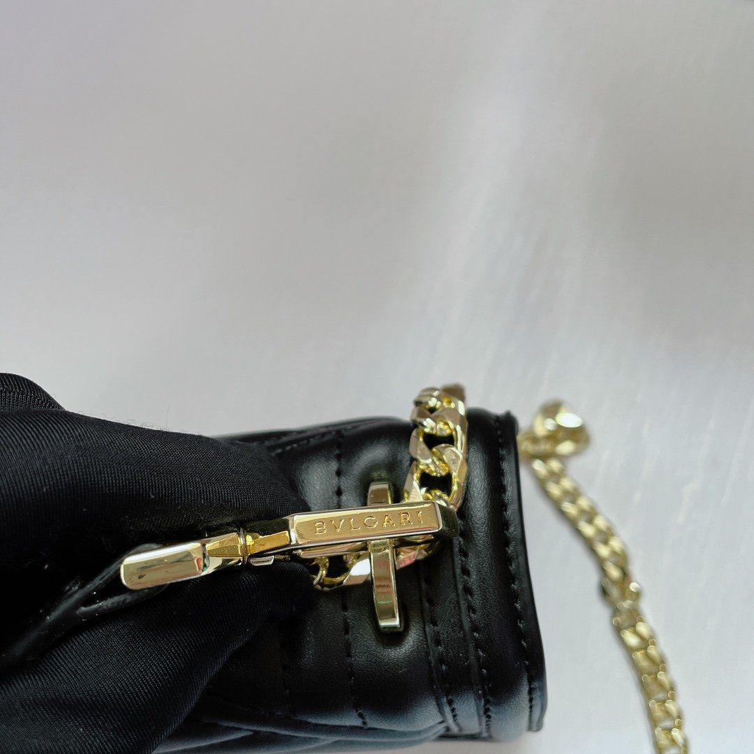 标志性细节:包袋前翻盖由传奇的“蛇头”搭扣稳固闭合;这一搭扣饰有哑光黑色珐琅鳞片与摄人心魄的黑色缟玛瑙双眸,宛如一颗璀璨的宝石,成为整款包袋的点睛之笔。包袋内部空间紧凑(尺寸为20厘米),容量恰好足以收纳日常随身必备品;内衬背面饰有 Bvlgari 金属品牌标识,并内置一面专属定制的化妆镜。