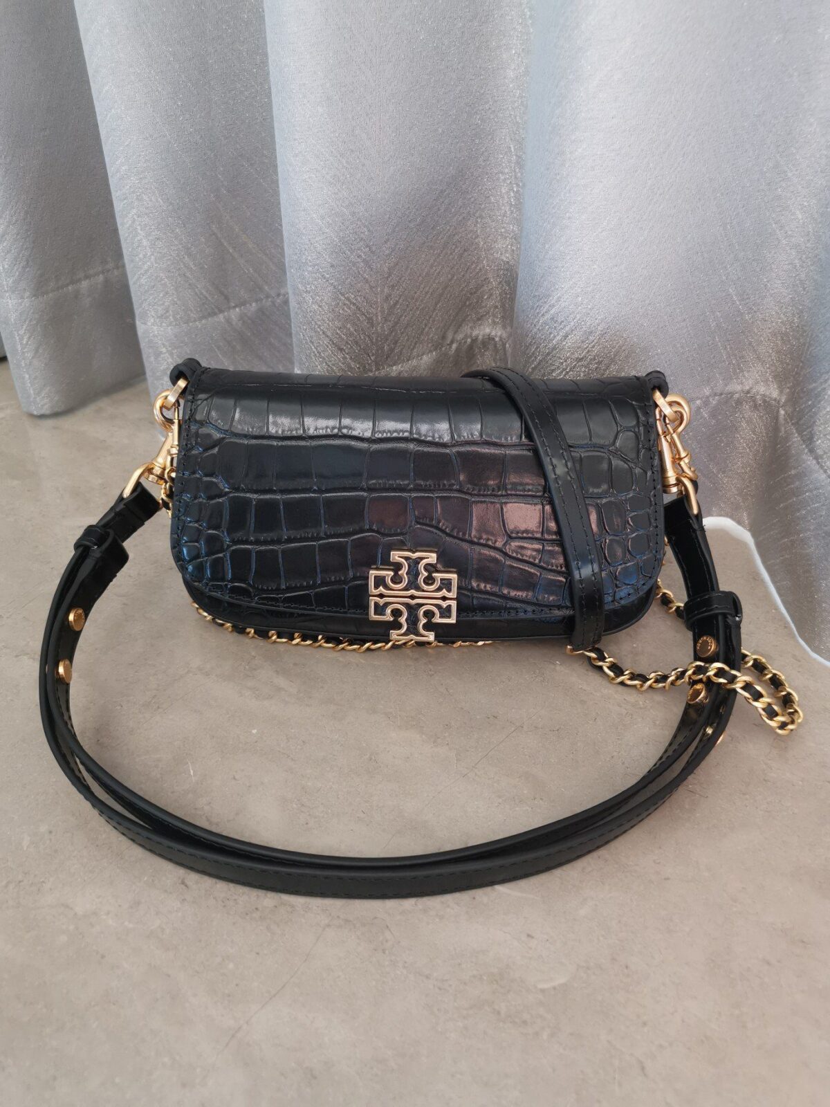 产品描述:Tory Burch Britten 小型单肩包是现代优雅风格的典范,其精致的“腋下包”廓形设计,无论白天还是夜晚的场合,都能实现完美过渡。这款包袋选用柔软且耐用的荔枝纹牛皮(部分特定款式采用奢华的鳄鱼纹压花皮革)精心打造,其标志性特征在于包盖正面醒目镶嵌的该系列经典镂空“双T”标志,并辅以抛光金色调五金配件点缀。