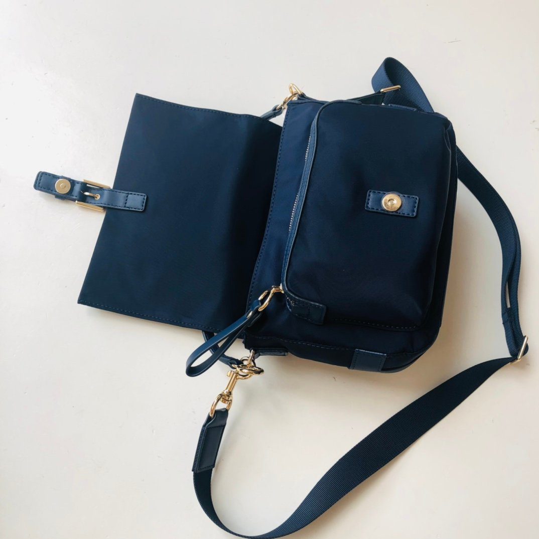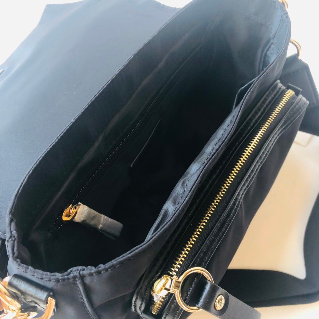 为了兼顾舒适度与多功能性,包袋配有一条宽版可调节织带肩带,能够均匀分散重量,无论是旅行途中还是忙碌奔波的一天,都能为您带来轻松自在的佩戴体验。包袋的五金配件设计独具匠心,金色的搭扣与挂钩在休闲的尼龙面料衬托下,更显奢华质感。