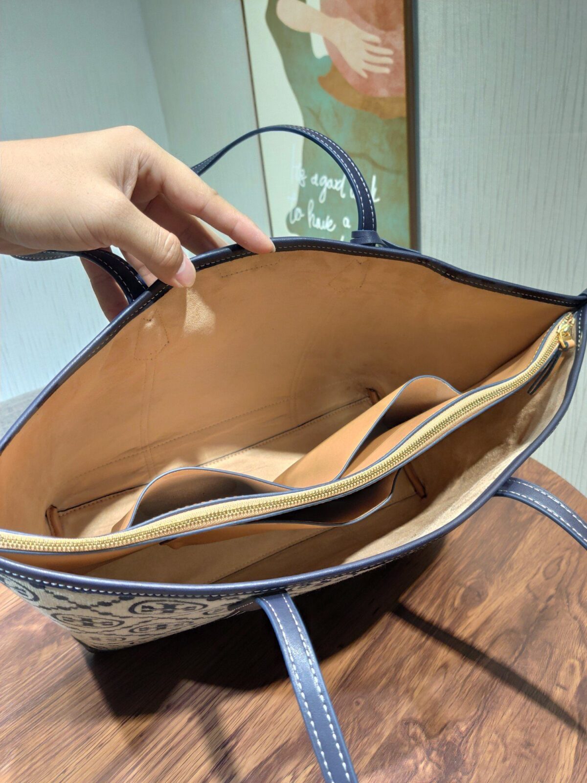 内部结构:3 个隔层(2 个开放式隔层,1 个中央拉链隔层),内衬采用仿麂皮材质
