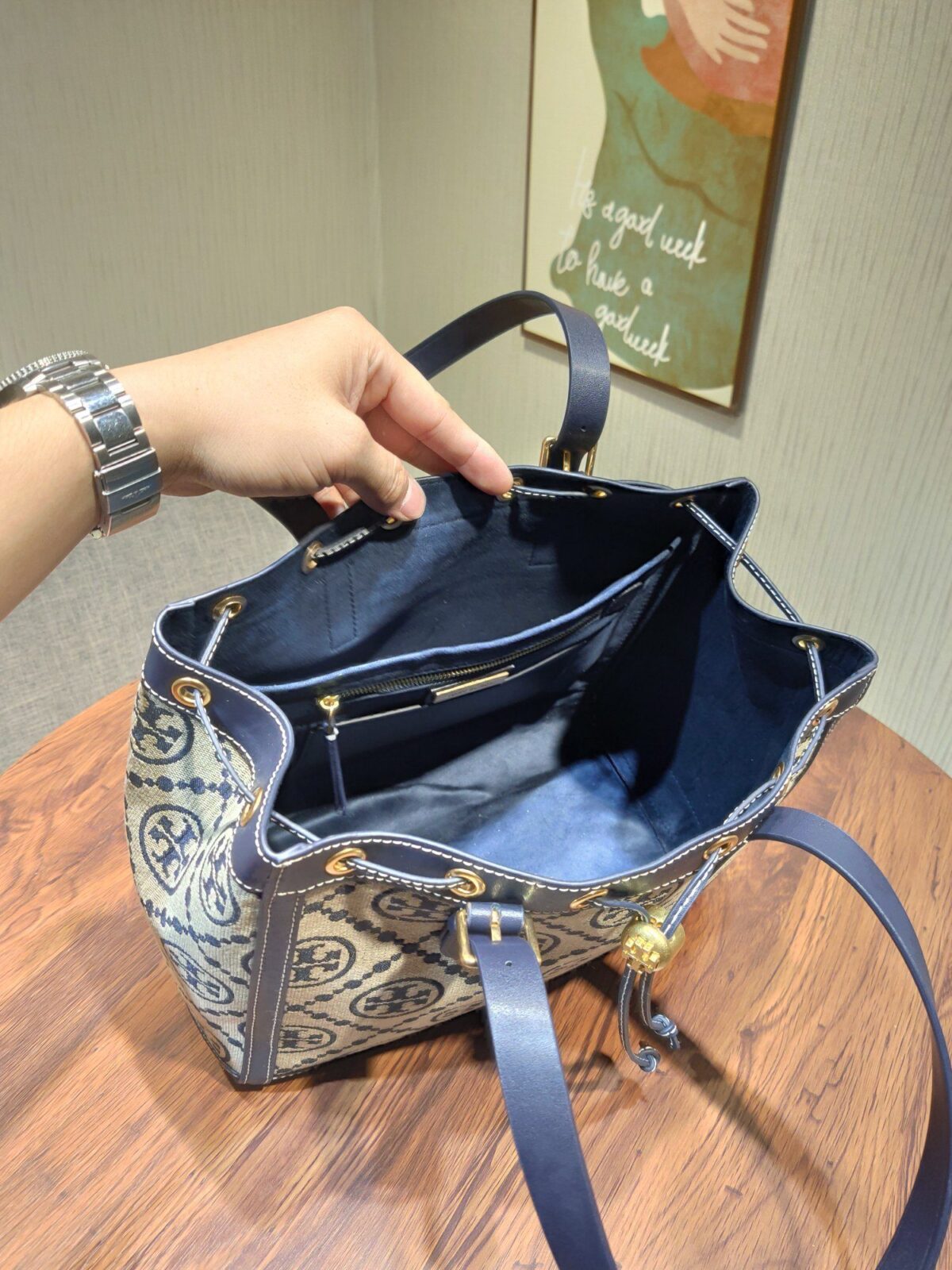 此款包袋的一大特色在于其抽绳式闭合设计,并饰有一枚金色双 T 标志调节扣;这一细节不仅提升了包袋的安全性,更为包身正面增添了一抹如珠宝般的点睛之笔。包身边缘饰有精致的皮革滚边,顶部配有可调节的皮革提手及搭扣细节,无论手提还是挽于臂弯,均可根据个人喜好调节至最舒适的长度。