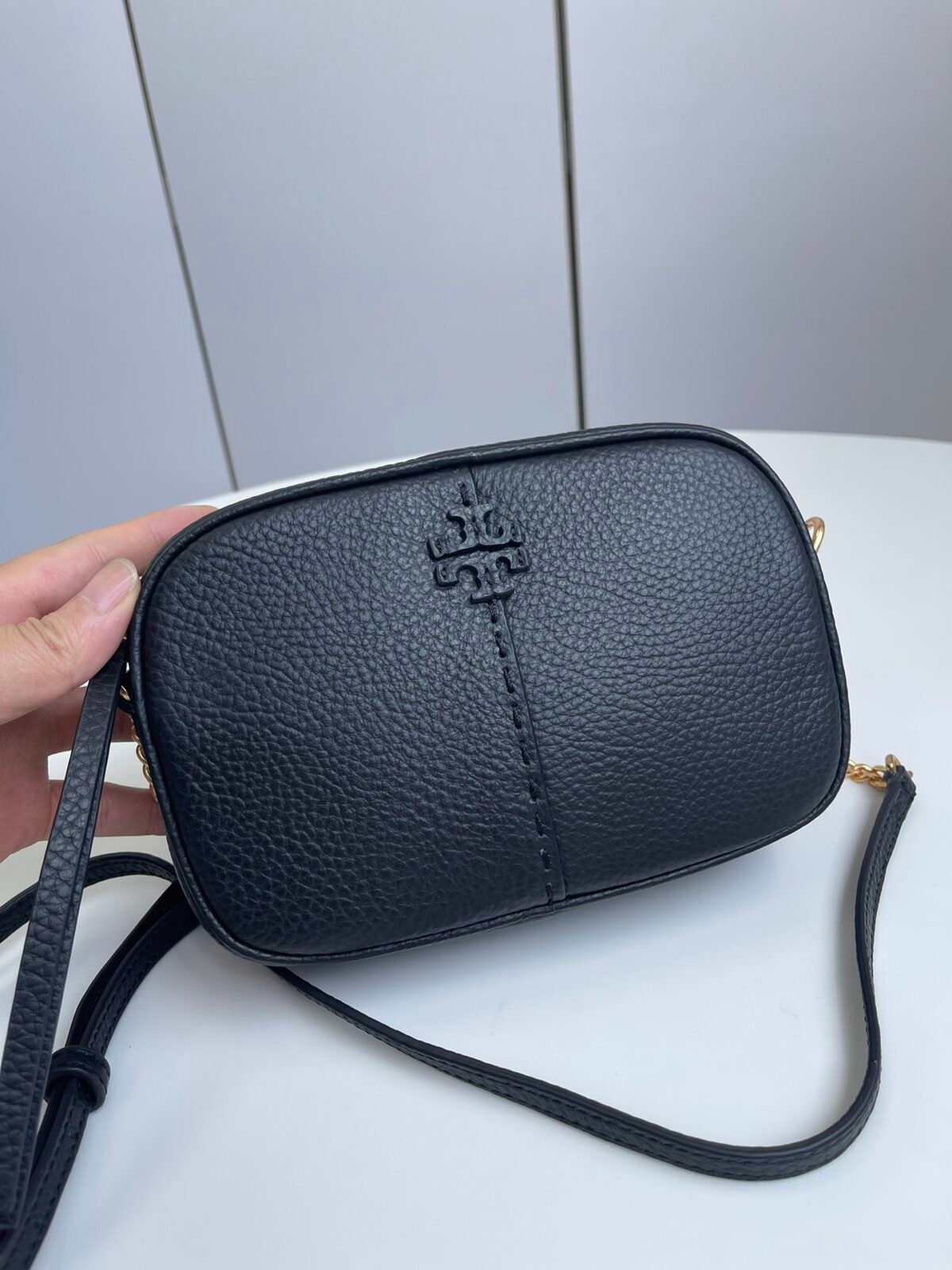 McGraw 相机包是低调奢华与随性风格的完美典范。这款“新品”的标志性特征在于其柔软的荔枝纹皮革质感,以及该系列独有的手工缝制“双T”标志——这一标志采用镂空皮革设计,并由垂直的手工缝线勾勒镶边。
